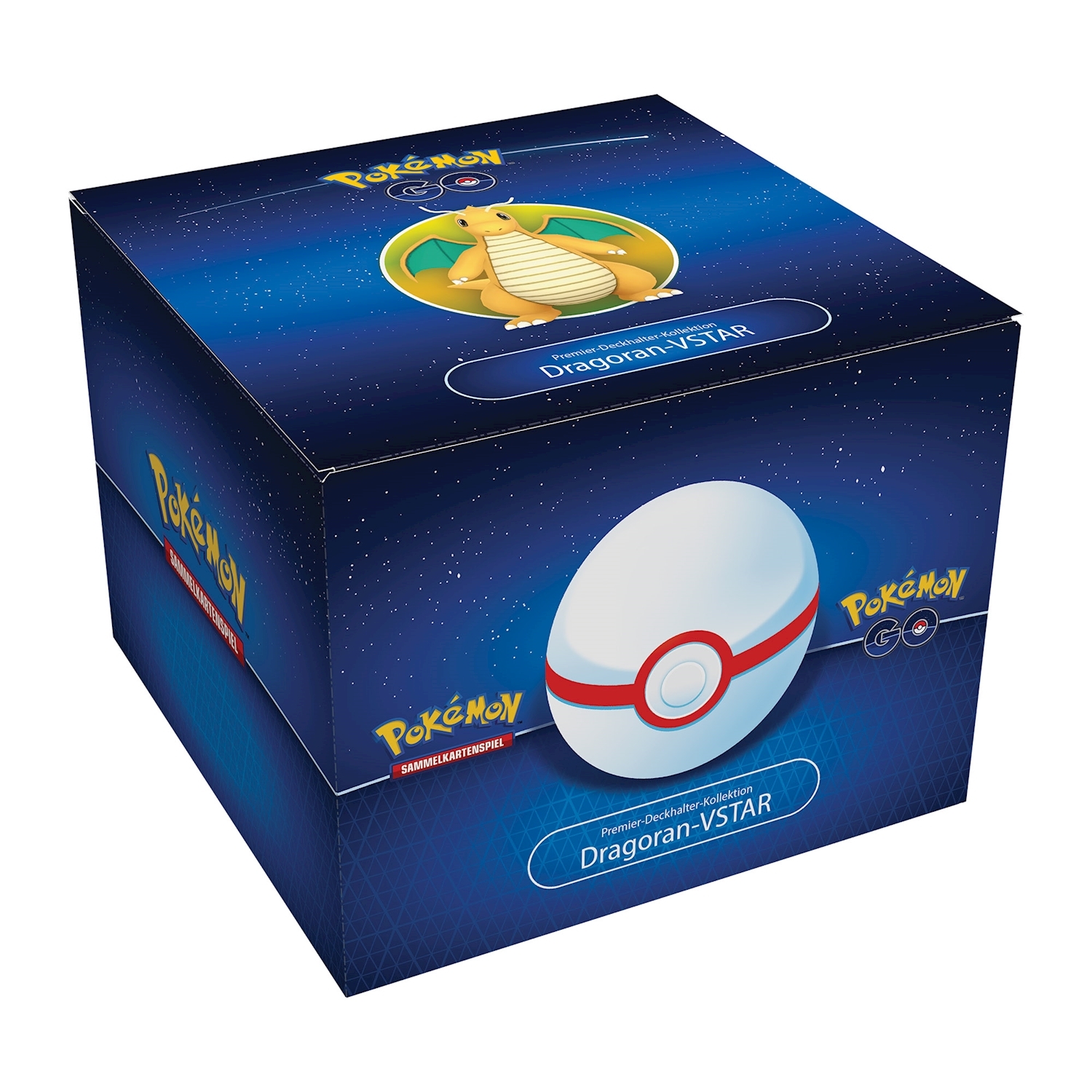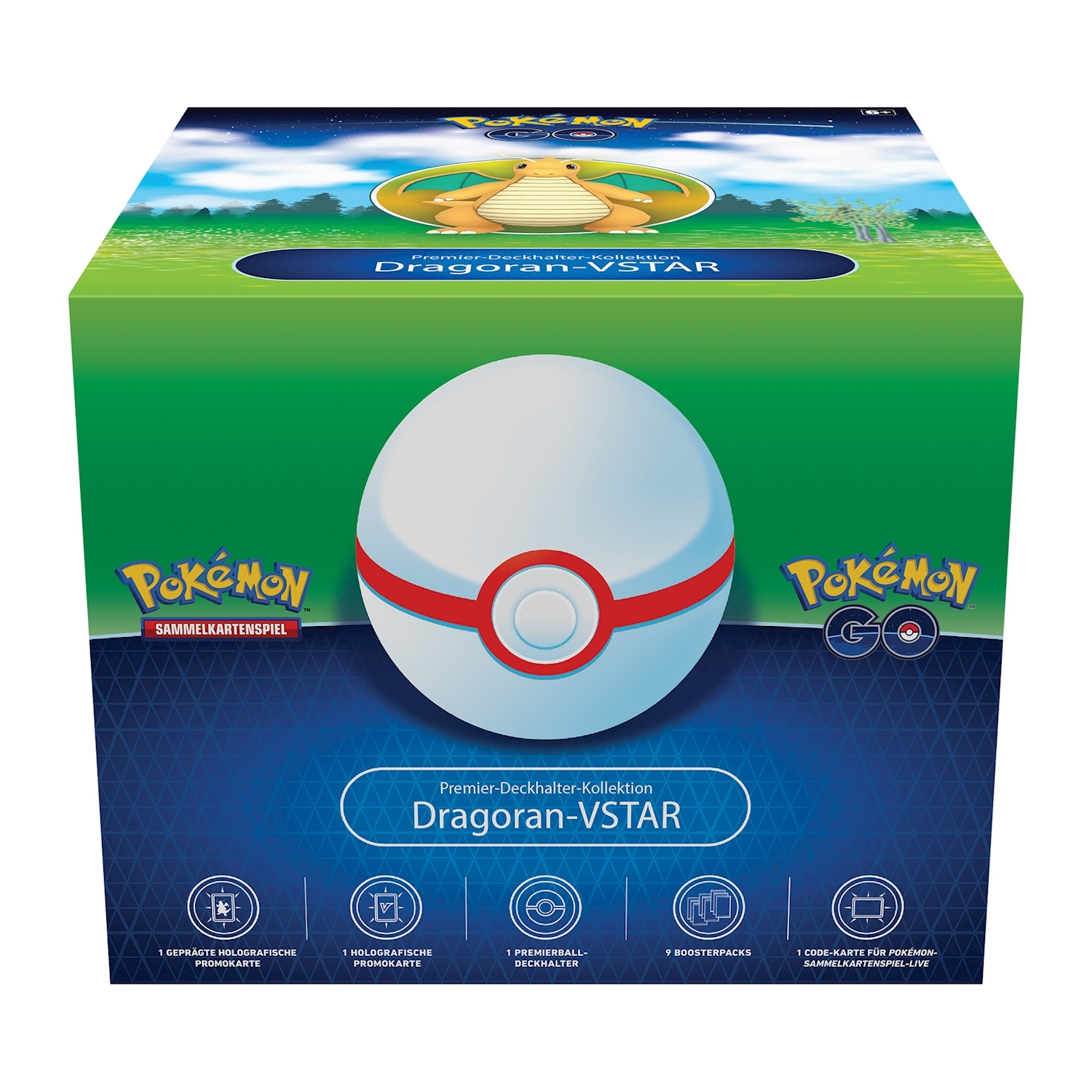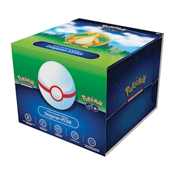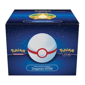 Inhalt: - 1 Dragoran VSTAR Promokarte - 1 Dragoran V Promokarte - 1 Premier Ball Deckbox - 9 Pokemon Go Booster Packs - 1 Pokemon TCG Live Codekarte