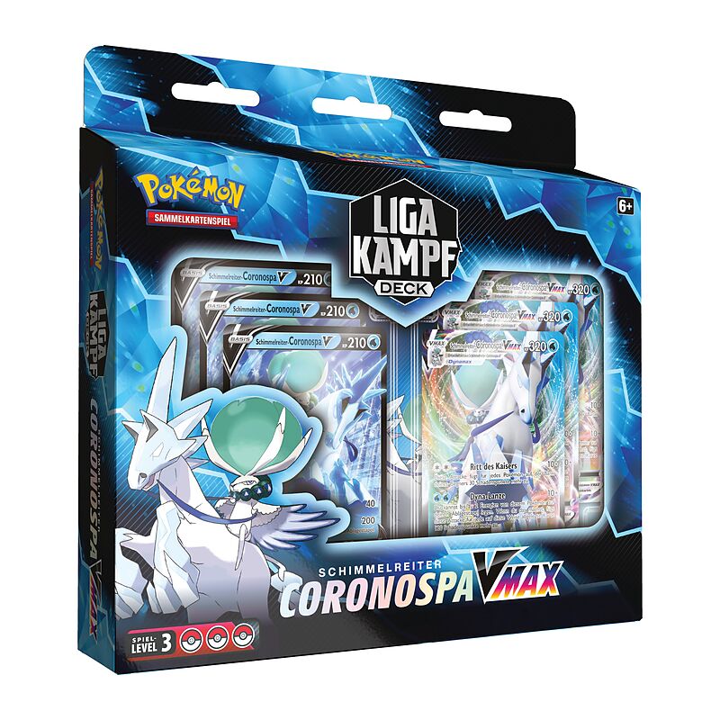 Jedes Liga-Kampfdeck Coronospa-VMAX des Pokémon-Sammelkartenspiels enthält: 1 komplettes, spielbares 60-Karten-Deck voller Powerkarten 3 holografische Karten mit Schimmelreiter-Coronospa-V oder Rappenreiter-Coronospa-V 3 holografische Karten mit Schimmelreiter...
