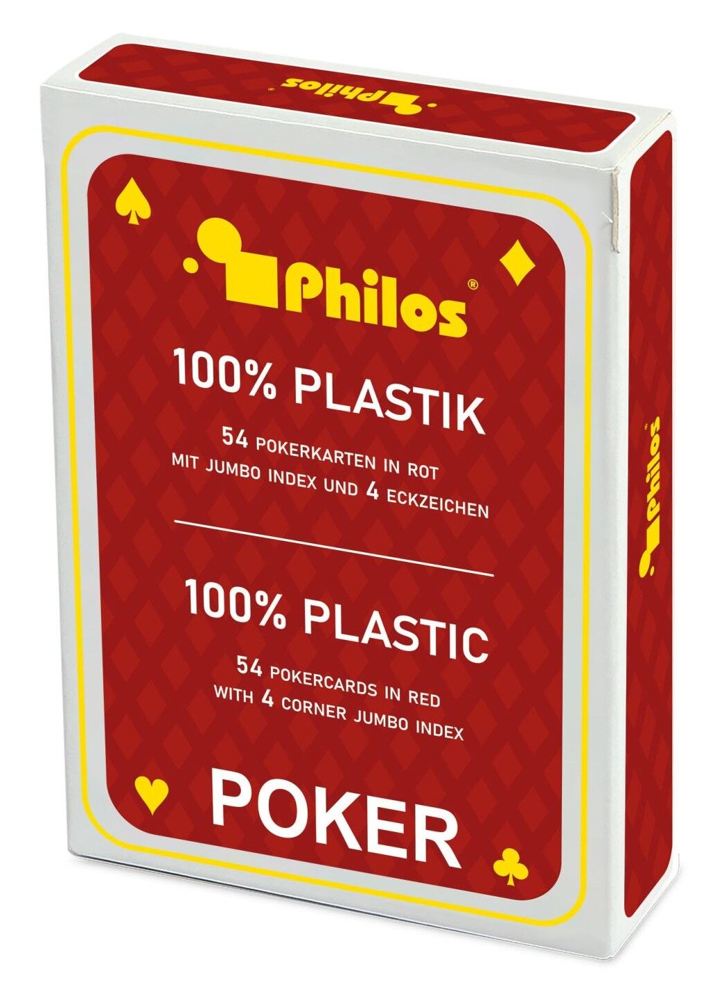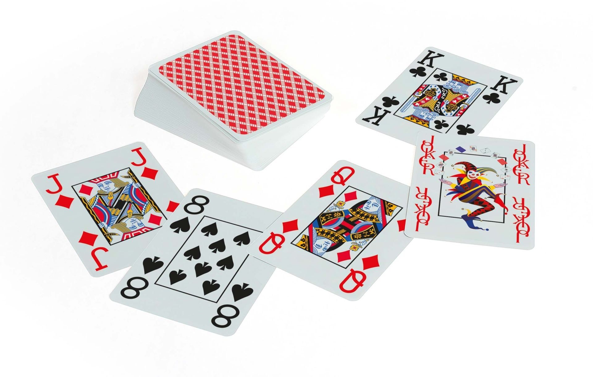 54 hochwertige Pokerkarten in rot aus stabilem Plastik mit Jumbo Face und 4 Eckzeichen. Die Oberflächen der Karten sind abwaschbar und damit lange haltbar. Maße Spiel: 91 x 65 x 19 cm Farbe: rot, weiß Material: Kunststoff Lernziele: Aufmerksamkeit, Gedächtnist...
