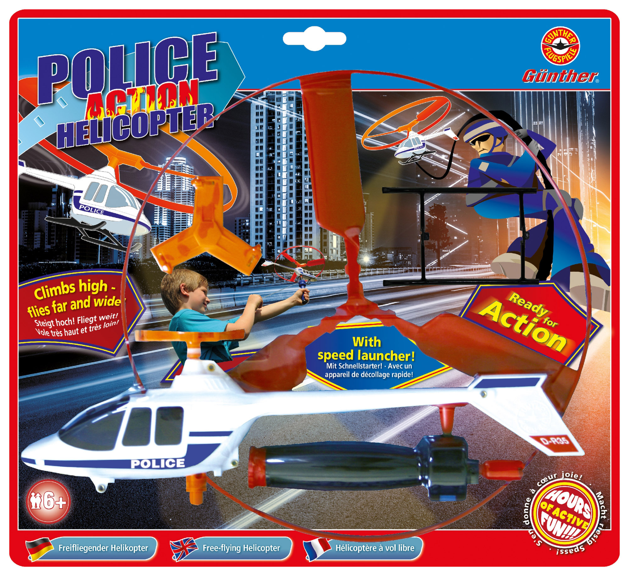 Günther PoliceCopter mit Schnellstart, 27 cm, 8+ Der Polizei-Hubschrauber von Günther ist ein tolles Flugmodell, da er nur senkrecht in die Höhe fliegt und selbst ein kleiner Garten schon zum Starten und zur Landung ausreicht. Das Fliegen lasen ist durch die e...
