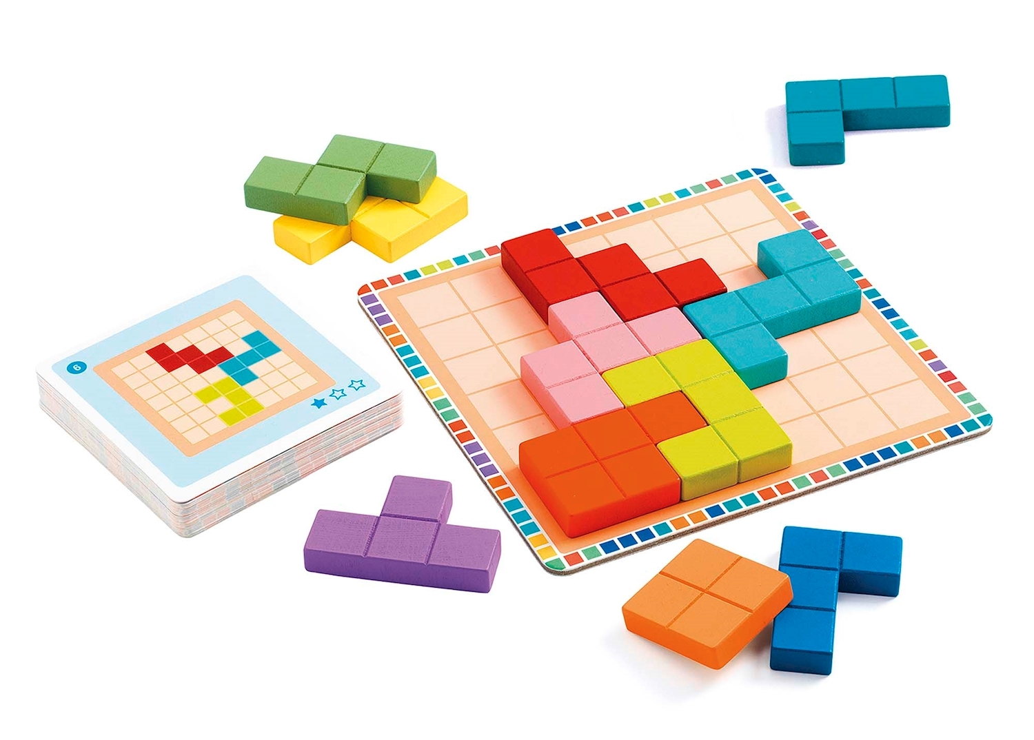 ab 7 Jahren 2 Spieler kurze Spieldauer von 10 min. 11 Holzteile, um einen perfektes Quadrat zusammenzubauen, und 30 Aufgabenkarten mit vorgegebenen Ausgangspositionen. Schalten Sie Ihr Gehirn ein!
