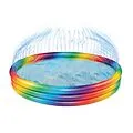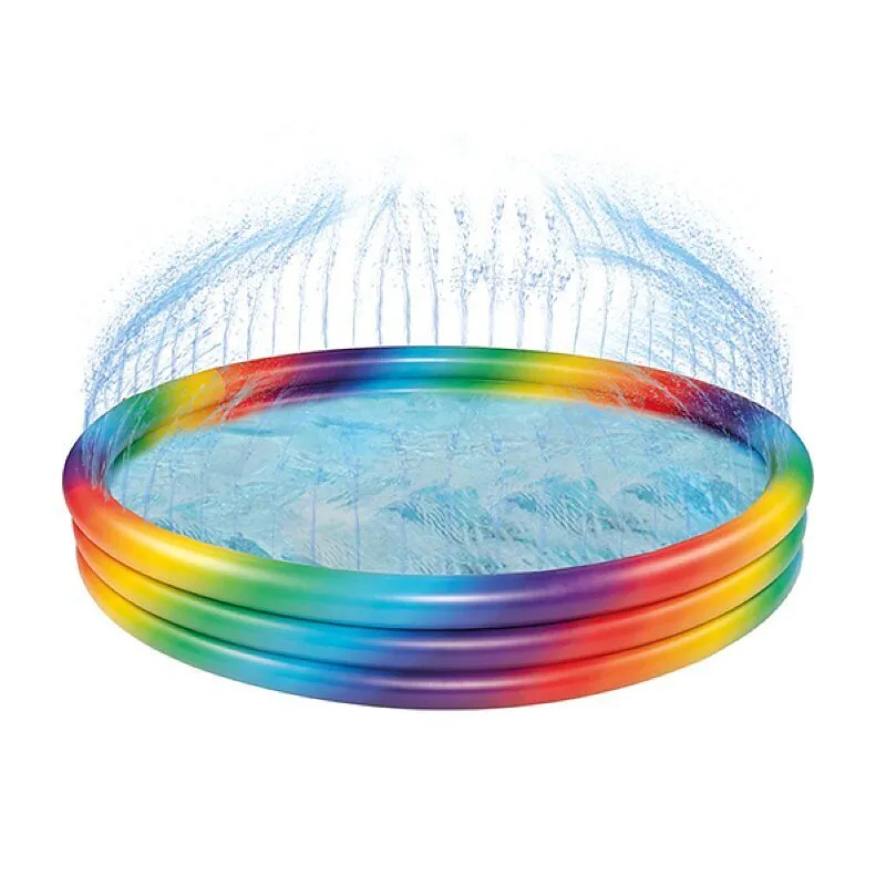 Dieser lustige Pool Rainbow mit Sprinkler im Topring, aufgeblasen ca. 150x25cm, 3 Ringe, Regenbogenfarben, Gartenschlauchanschluss.