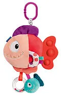 Dieser Kuschel-Piranha mit klapperndem Fischbaby kommt ganz friedlich angeschwommen. Flossen zum Greifen, eine bunte Rassel und verschiedene Materialien stimulieren die Sinne und fördern die Feinmotorik und Wahrnehmung von Babys. Der Fischschwanz aus 100% Sili...