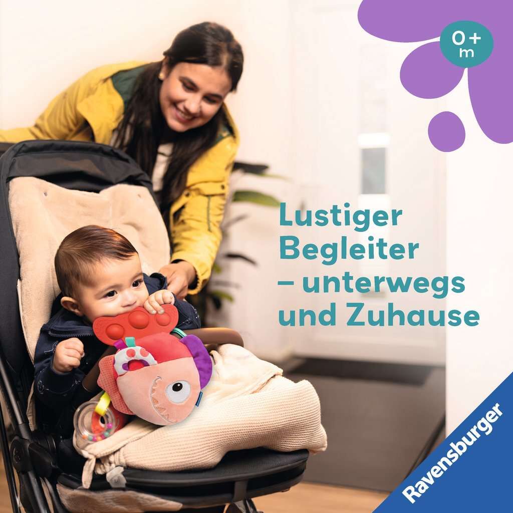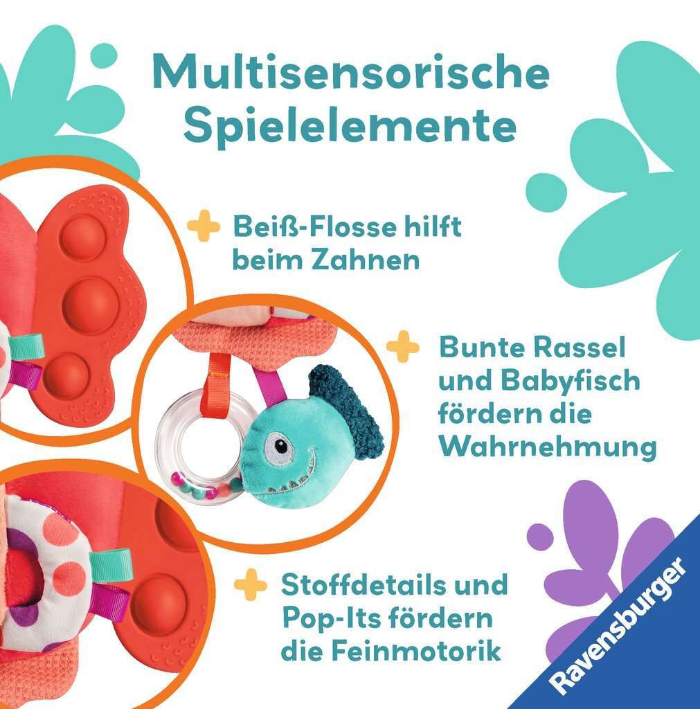 Dieser Kuschel-Piranha mit klapperndem Fischbaby kommt ganz friedlich angeschwommen. Flossen zum Greifen, eine bunte Rassel und verschiedene Materialien stimulieren die Sinne und fördern die Feinmotorik und Wahrnehmung von Babys. Der Fischschwanz aus 100% Sili...