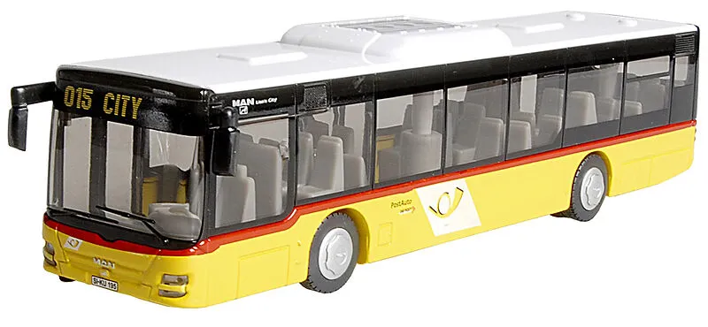 Modell des Original MAN Lion's City Linien-Postautos im Massstab 1:50 als City Postbus. Die Räder sind mit gummierten Laufflächen. 2 Türen an der rechten Fahrzeugseite zum Öffnen. Motorklappe im Heck zum Öffnen und getönte Scheiben. Separate Rückspiegel und ei...
