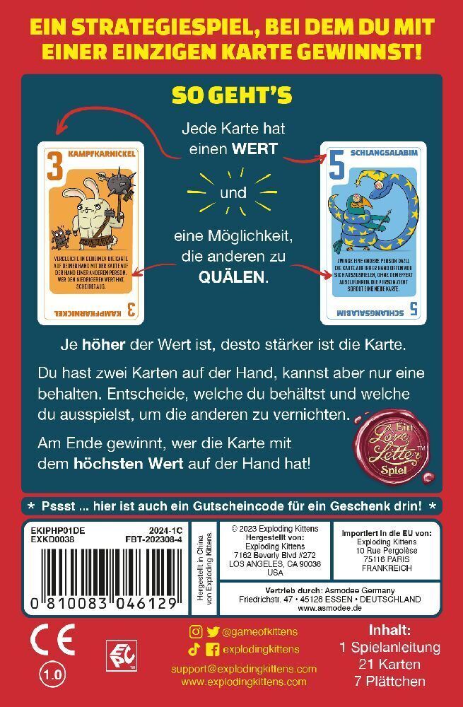 Im trügerisch einfachen Partyspiel Power Hungry Pets treffen zwei Legenden aufeinander: Love Letter und Exploding Kittens®. Jede Karte hat einen Wert und eine Möglichkeit, die anderen Spieler zu quälen. Je höher der Wert ist, desto stärker ist die Karte. Du ha...