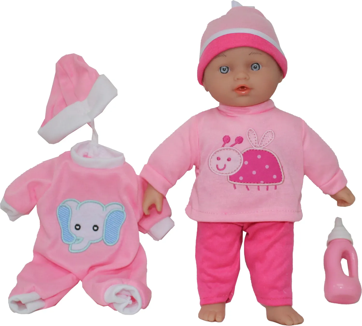 Die süsse Puppe trägt ein Mützchen, ein Oberteil und weiche Hosen. Im Set enthalten sind ein extra Strampelanzug, ein weiteres Mützchen und ein Fläschchen.