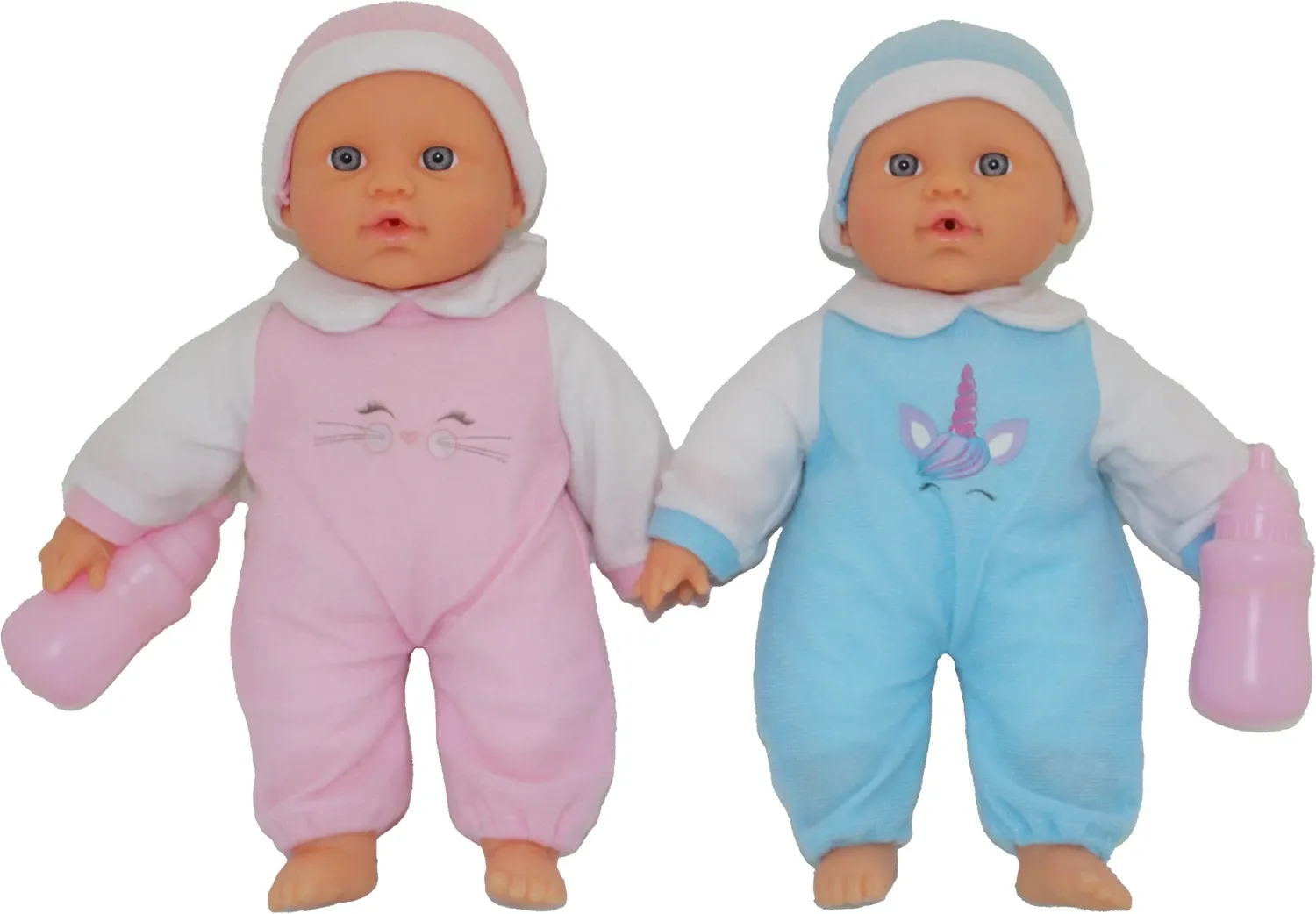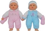 Dieses Puppenset sorgt für doppelten Spielspass. Die süssen Zwillingsbabies tragen je einen rosaroten und hellblauen Strampelanzug mit dem passenden Mützchen. Mit zwei rosafarbenen Fläschen.