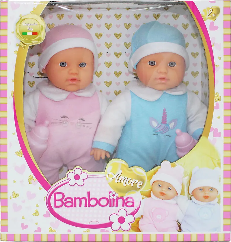 Dieses Puppenset sorgt für doppelten Spielspass. Die süssen Zwillingsbabies tragen je einen rosaroten und hellblauen Strampelanzug mit dem passenden Mützchen. Mit zwei rosafarbenen Fläschen.