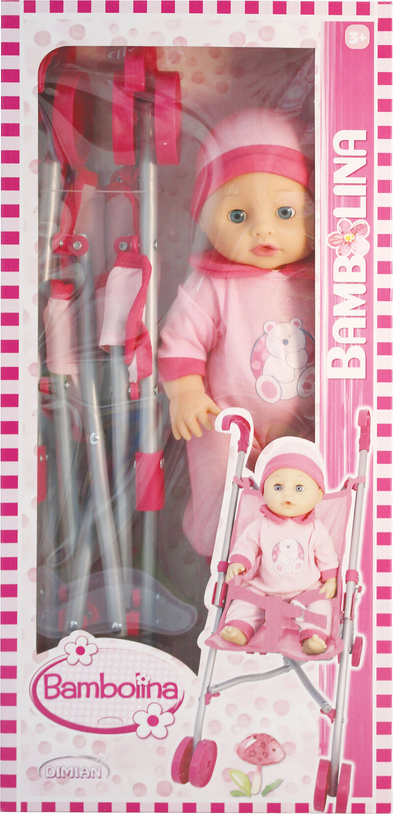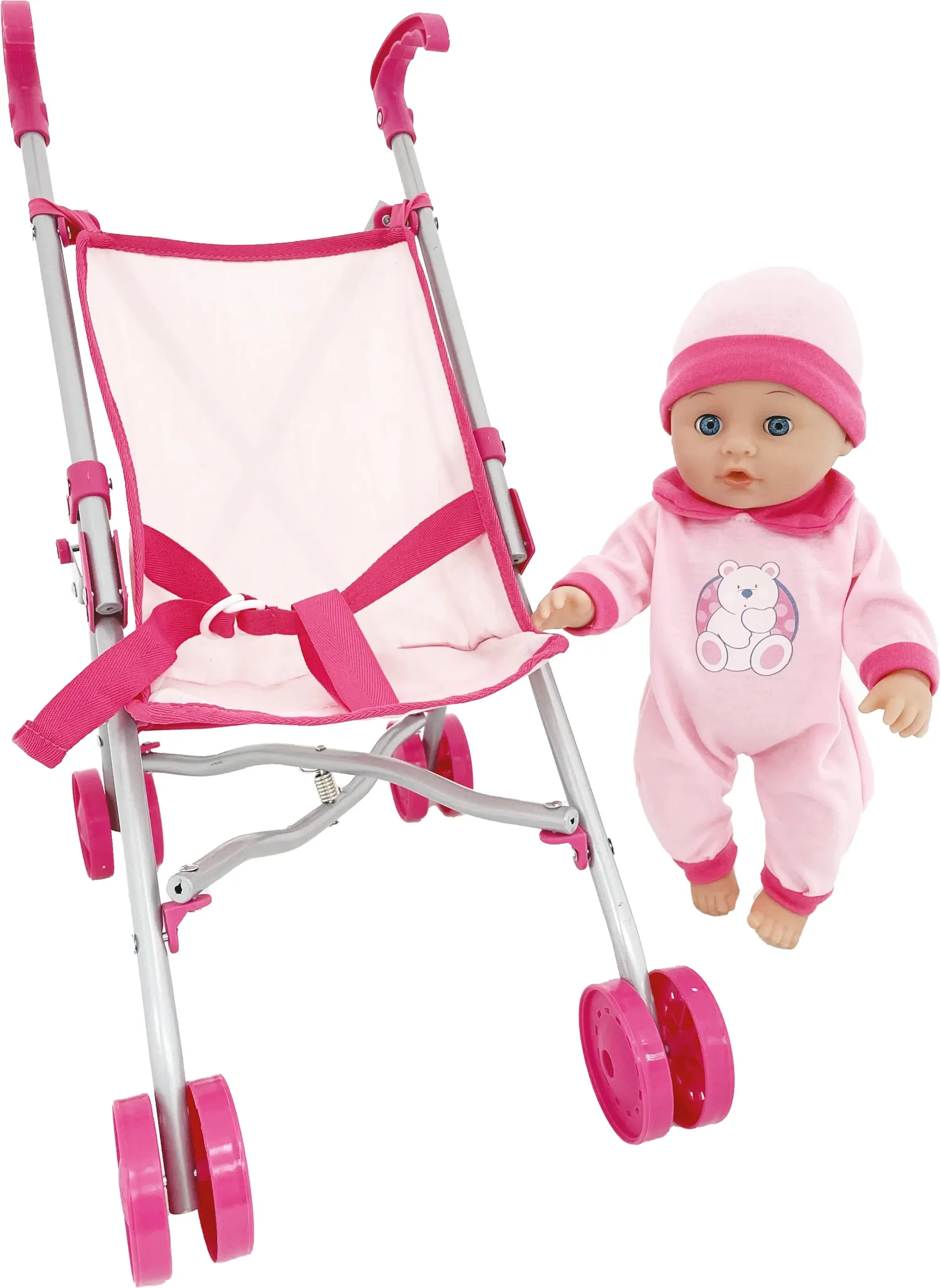 Was für ein tolles Set: die Babypuppe im Strampelanzug und Mützchen wartet sehnsüchtig auf die Fahrt im Buggy. Der Buggy kann zusammengefaltet und platzsparend versorgt werden, wenn der Ausflug vorbei ist.