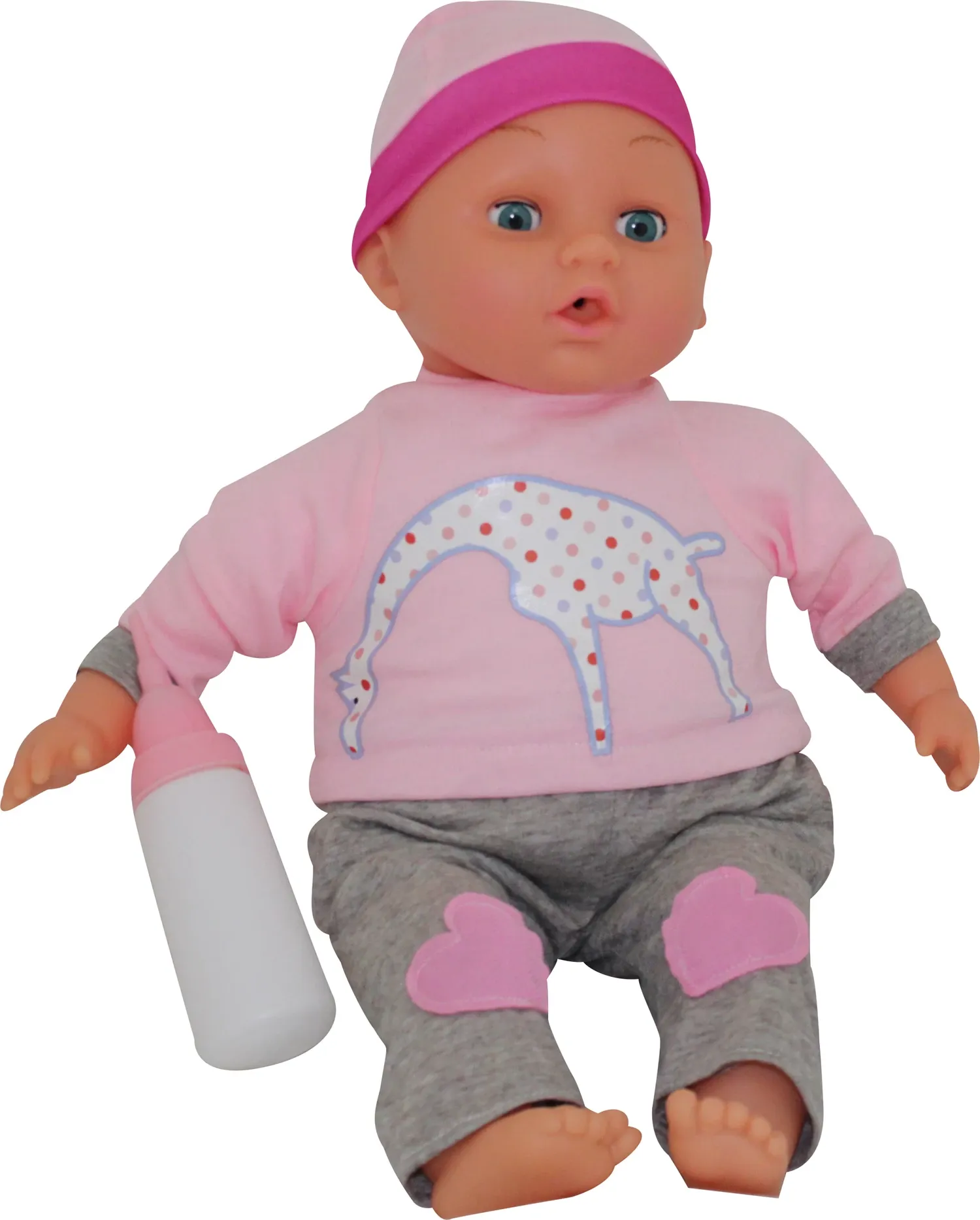 "Die Puppe hat einen weichen Körper und kann ihren Mund bewegen. Das Baby kann glucksen, ""Mama"" und ""Dada"" sagen sowie weinen und Babygeräusche machen. Mit Fläschchen."