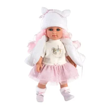 35cm große Fashion Doll mit blauen Augen, welligem pinken Haar und weichem Körper. Kopf, Arme und Beine sind aus Vinyl. Das trendige Outfit bestehend aus Tüllkleid, Oberteil mit Einhornmotiv und Glitzersöckchen aus weisser und grauer Wolle. Inklusive flauschig...