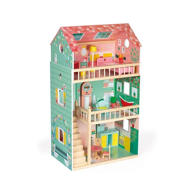 Puppenhaus aus Holz. Geeignet für 30 cm Puppen. In mädchenhaften, zarten Farben. Inklusive 12 Teile Mobiliar. 3 Ebenen. Das Dach ist auf der einen Seite offen, so dass leicht im obersten Stockwerk gespielt werden kann. Ausgestattet mit einer Treppe aus Holz un...