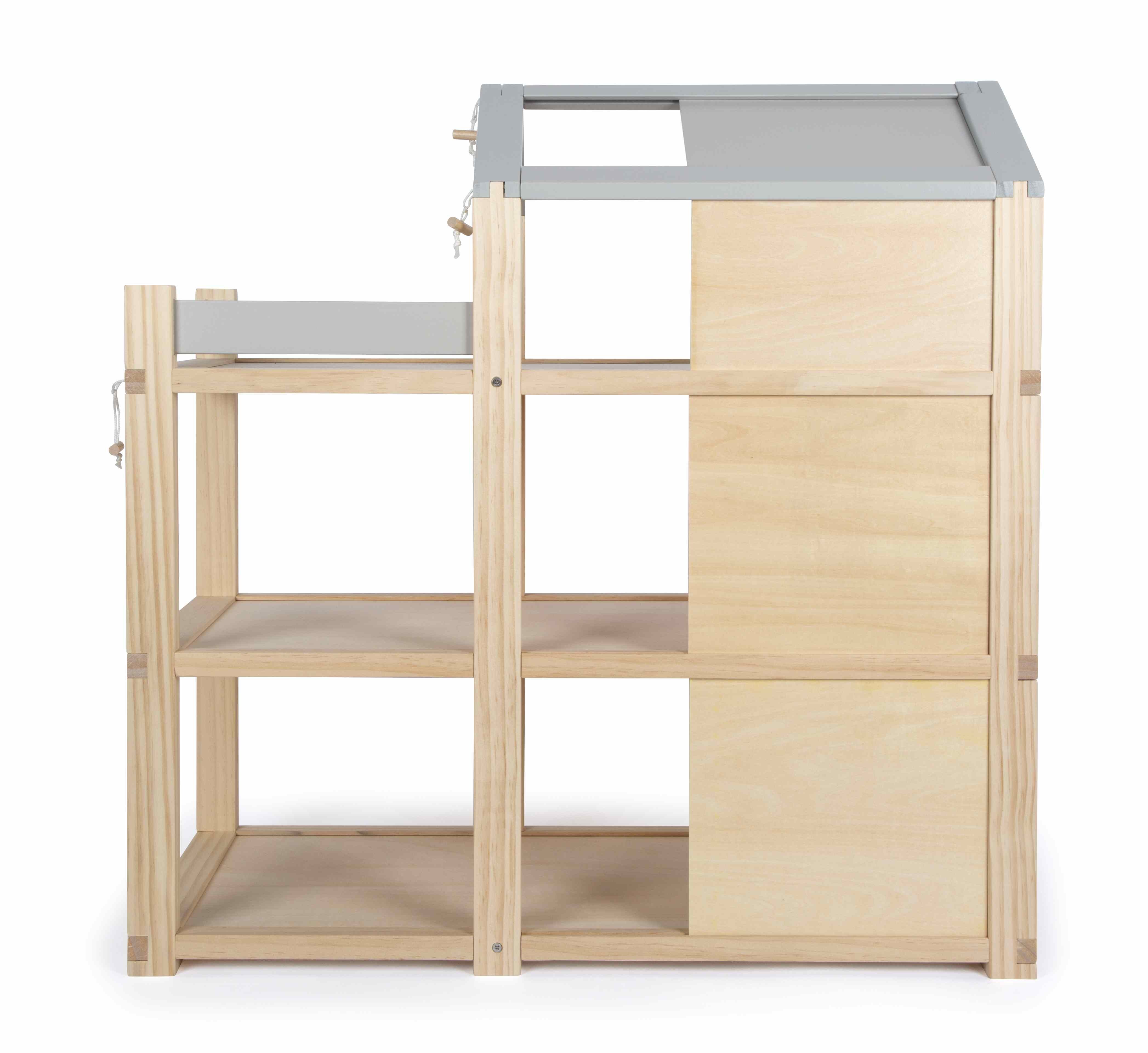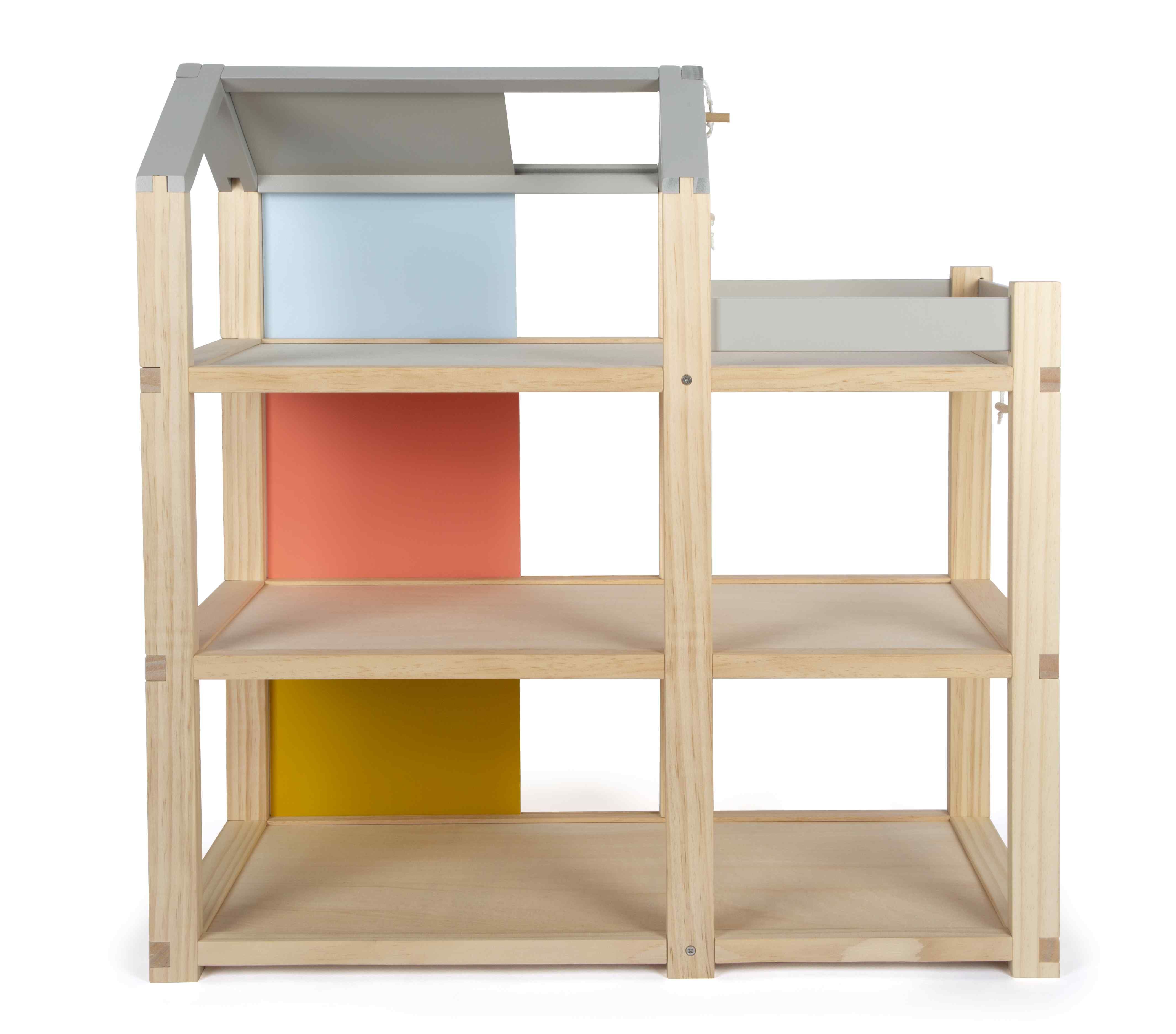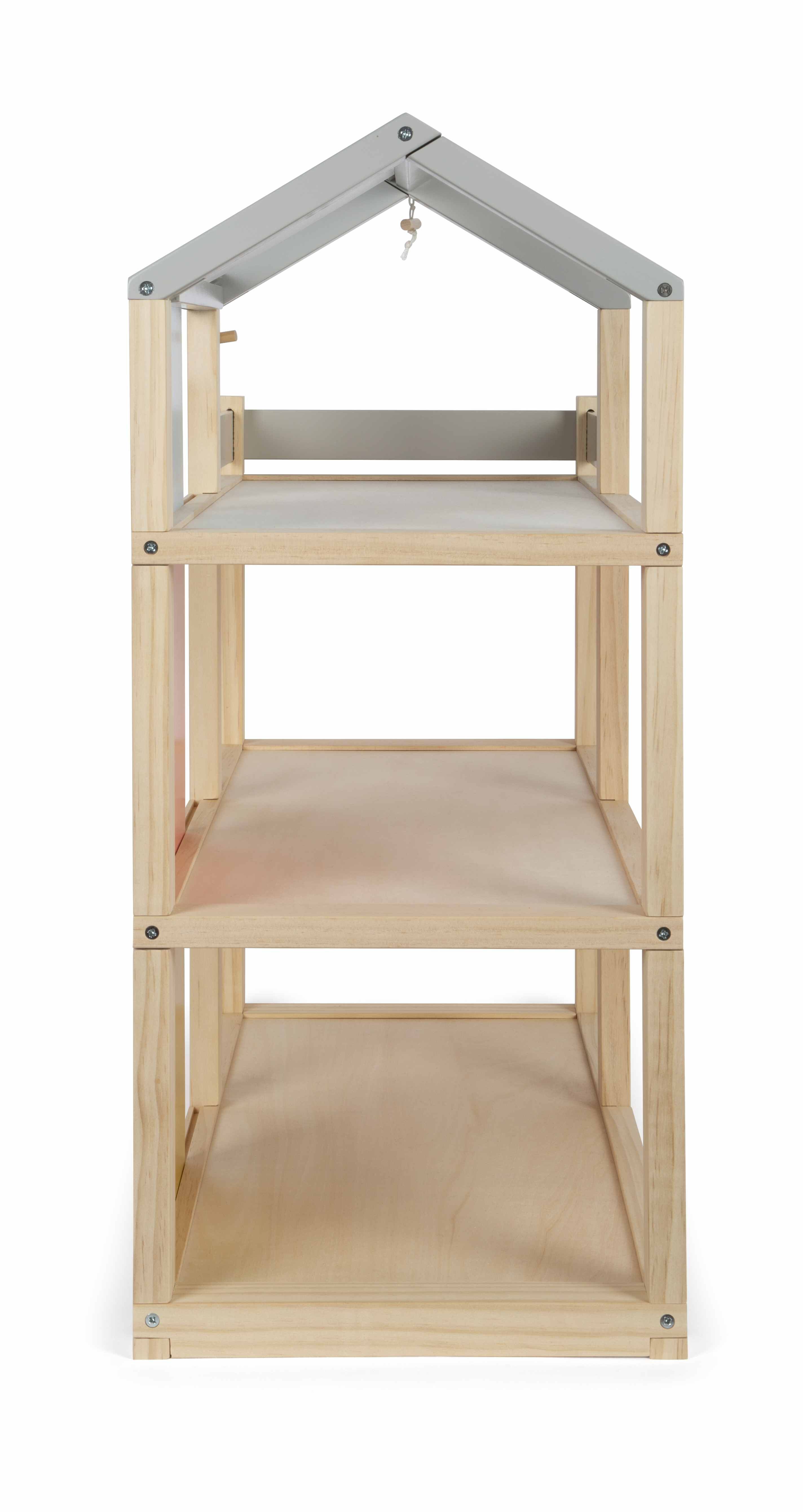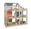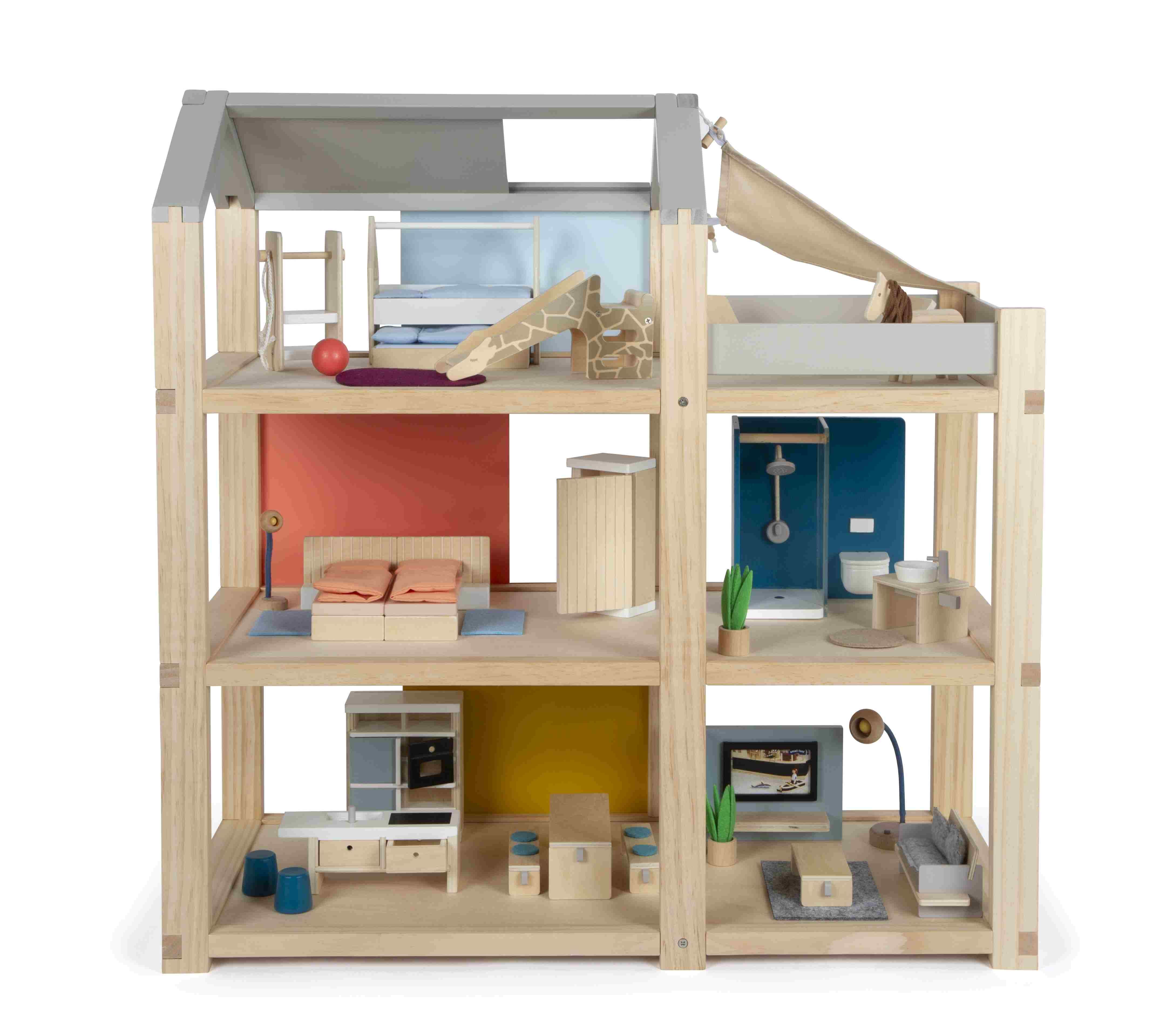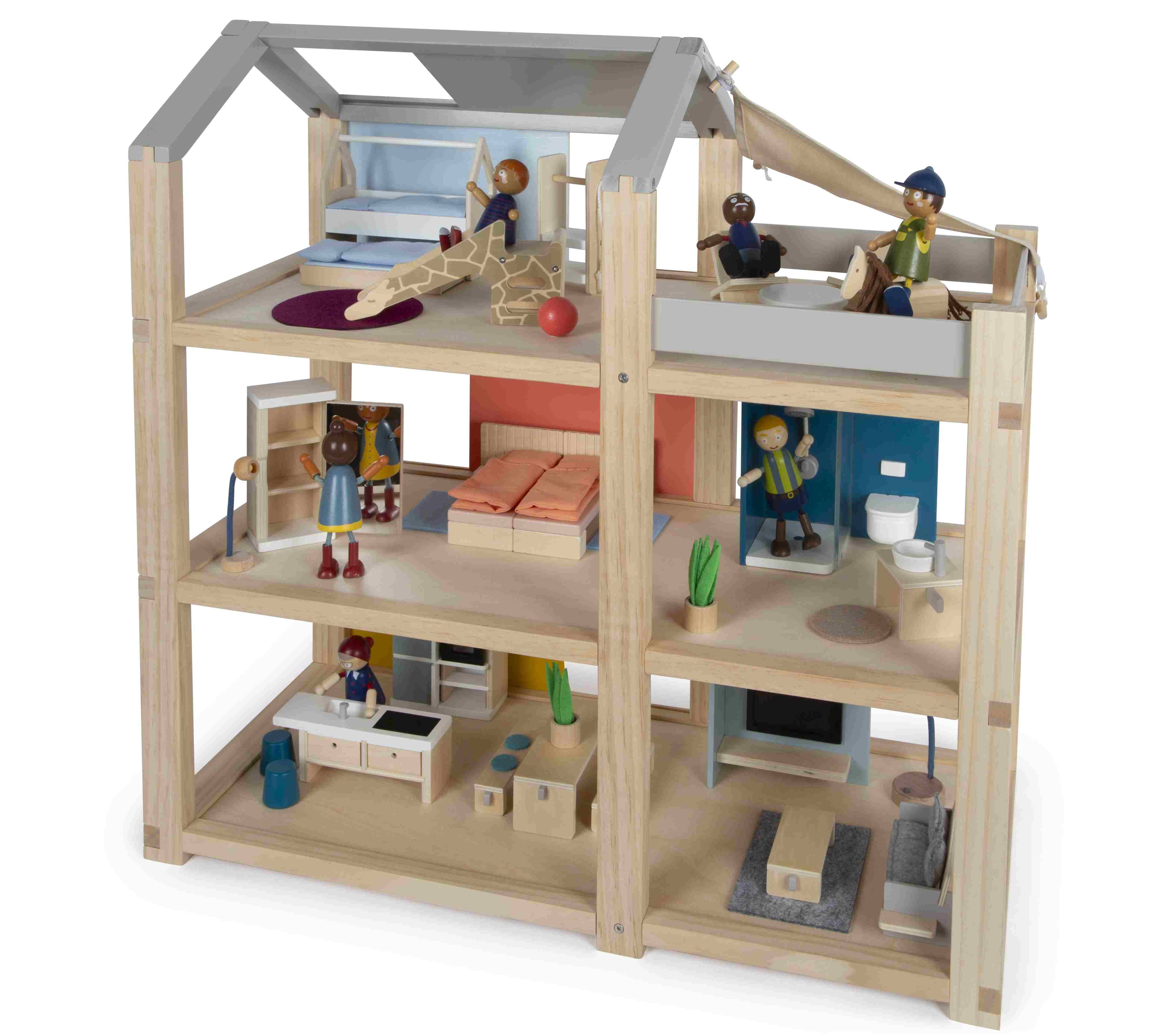 Ein Haus voller Möglichkeiten! Individuelles Design für grenzenlosen Spielspaß und liebevoll ausgestattete Räume sind das, was dieses moderne Puppenhaus auszeichnet: Das Haus erstreckt sich über drei Stockwerke und bietet eine geräumige Dachterrasse. Die versc...Ein Haus voller Möglichkeiten! Individuelles Design für grenzenlosen Spielspaß und liebevoll ausgestattete Räume sind das, was dieses moderne Puppenhaus auszeichnet: Das Haus erstreckt sich über drei Stockwerke und bietet eine geräumige Dachterrasse. Die verschiebbaren Rückwände ermöglichen es kleinen Architekten, das Aussehen ihres Puppenhauses immer wieder neu zu gestalten. Mit den doppelseitig verwendbaren Rückwänden kann der Look des Holzpuppenhauses nach eigenem Geschmack verändert werden. Die farbigen Rückwände bringen lebendige Farben ins Spiel, während die unlackierte Seite den natürlichen Holzcharme bewahrt. Auch die Dachfläche des Puppenhauses lässt sich verschieben, sodass Kinder selbst bestimmen können, wo die Fensterflächen sein sollen. Dies fördert nicht nur Kreativität im Spiel, sondern auch räumliches Vorstellungsvermögen. Der sichtbare Vollholzanteil verleiht dem Puppenhaus einen modernen skandinavischen Look, der sowohl Kinder als auch Erwachsene begeistert. Das Haus ist mit vielen detailverliebten Puppenhausmöbeln voll ausgestattet, die jeden Raum zum Leben erwecken. Kein zusätzliches Zubehör ist nötig dieses Puppenhaus ist sofort bereit zum Losspielen! Es gibt ein gemütliches Schlafzimmer, ein farbenfrohes Kinderzimmer mit Giraffenrutsche, ein stilvolles Badezimmer, eine moderne Küche, ein charmantes Esszimmer und ein gemütliches Wohnzimmer. Auf der Dachterrasse laden Möbel, ein Holzpferd und ein passendes Sonnensegel zum Entspannen und Spielen ein. Ideal für Biegepuppen mit einer Größe von 12 cm. Im Puppenhaus beginnt das Spielabenteuer und kein Tag gleicht dem anderen es ist ein Ort, an dem Träume wahr werden und Kreativität blüht. Das gradlinige Holzhaus bietet unendlich viele Möglichkeiten für fantasievolles Rollenspielen und fördert nebenbei motorische, sprachliche und soziale Kompetenzen. Ausstattung der einzelnen Räume: Schlafzimmer mit zwei Betten (als Doppelbett oder Einzelbetten verwendbar), 2 Kissen, 2 Bettdecken, 1 Kleiderschrank mit Böden und Spiegel, 1 Bogenleuchte und 2 Läufer. Badezimmer mit Dusche und Acrylglasduschwand sowie einstellbarer Brausenhöhe, 1 hängendes WC mit klappbarem Toilettendeckel, 1 Duschvorleger sowie 1 Waschbecken mit Handtuchhalter. Küche mit Hochschrank und freistehender Kücheninsel mit 2 Hockern, Kochplatte, Spülbecken, und 2 entnehmbaren Schubladen, Hochschrank mit Kühl-Gefrierkombination, Küchenregale, bewegliche (Backofen-)Tür, individuell gestaltbare Rückwandpappen für den Hochschrank zum Einschieben. Esszimmer mit Tisch und 2 Bänken inkl. 4 Sitzpolstern. Wohnzimmer mit 1 Sofa inkl. 3 Kissen, großer verstellbarer Bogenlampe, 1 Filzteppich, 1 Wohnzimmertisch, 1 Zimmerpflanze und 1 Flachbildfernseher mit Ablage und 2 wendbaren TV-Programm-Karten (auf der Rückseite bemalbar und zum Einstecken in den Fernseher). Kinderzimmer mit 1 Bett in Hausform inkl. herausziehbarem Gästebett und Bettwäsche, 1 Giraffenrutsche, 1 Ball, 1 Springseil und großem Spielteppich. Balkon mit 2 Loungesesseln, 1 runder Tisch, 1 Holzpferd mit Mähne und Schweif sowie 1 abnehmbares Sonnensegel.