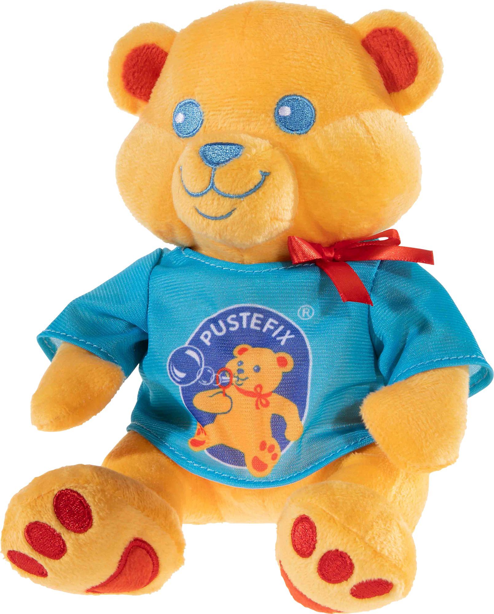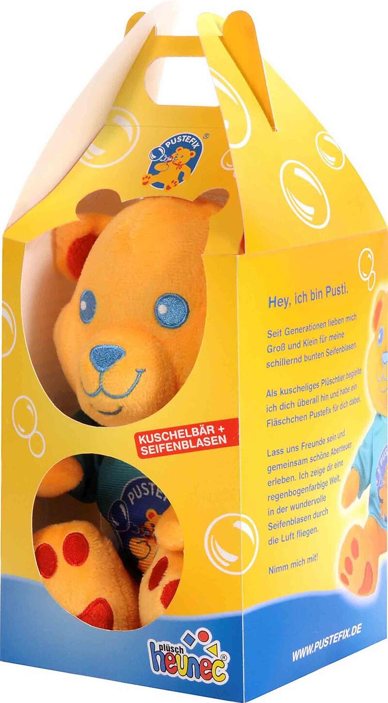 Pustefix Bundle Bär + Seifenblasen Der Pusti Kuschelbär ist mit viel Liebe zum Detail gestaltet. Sein freundliches, gesticktes Gesicht und der roten Schleife trägt mit voller Stolz sein blaues Pustefix T-Shirt. Der Bär ist besonders. Die Pustefix Seifenblasen ...