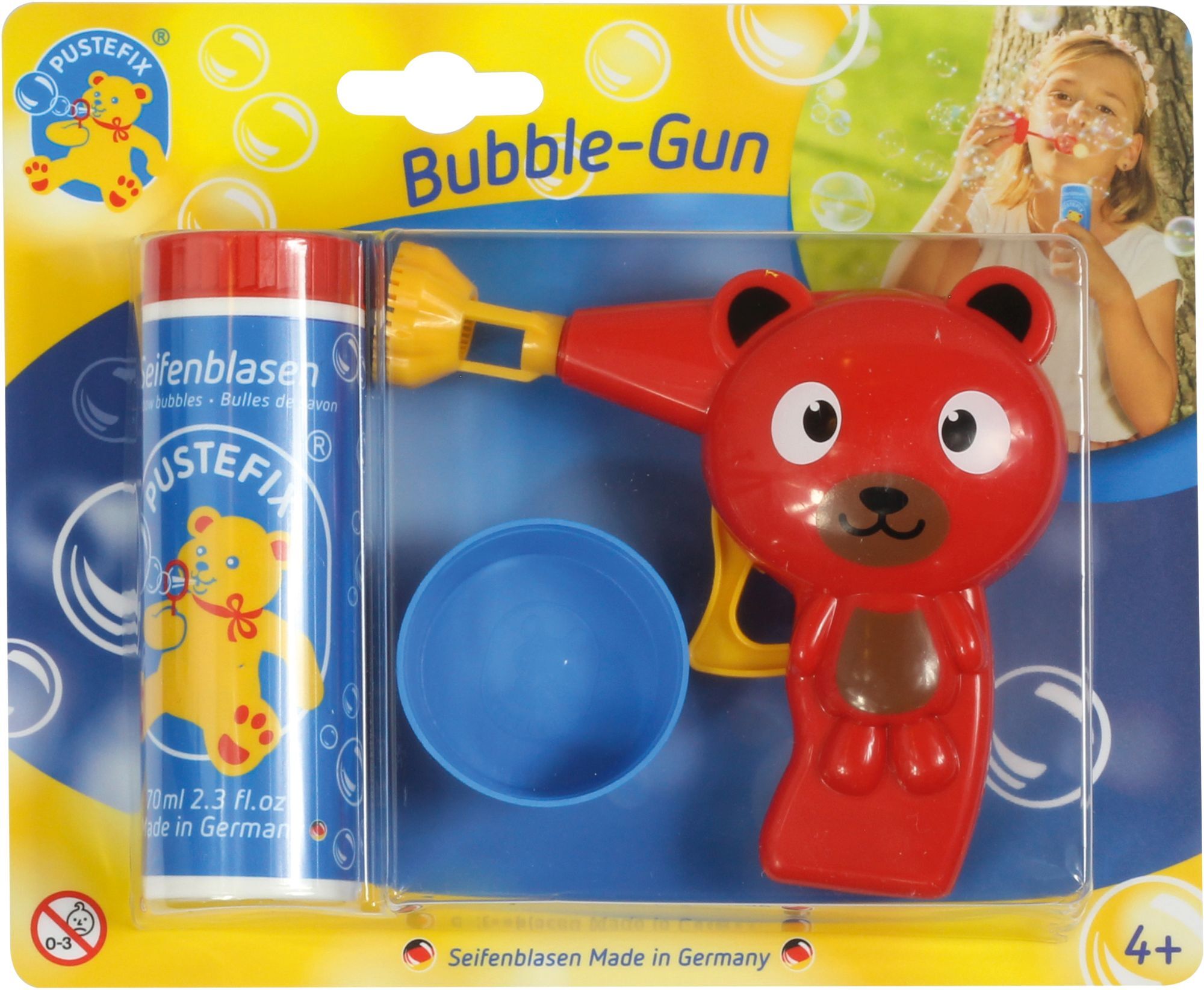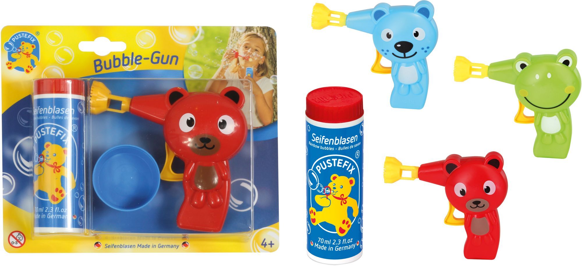 Mit dieser tollen Seifenblasen Pistole von Pustefix kannst Du lustige Seifenblasen-Schlachten veranstalten! Die Pistole in Form eines Tieres, roter Bär, blauer Bär oder grüner Frosch, wird einfach mit der Pustefix Lösung gefüllt und schon geht der Spaß los! En...