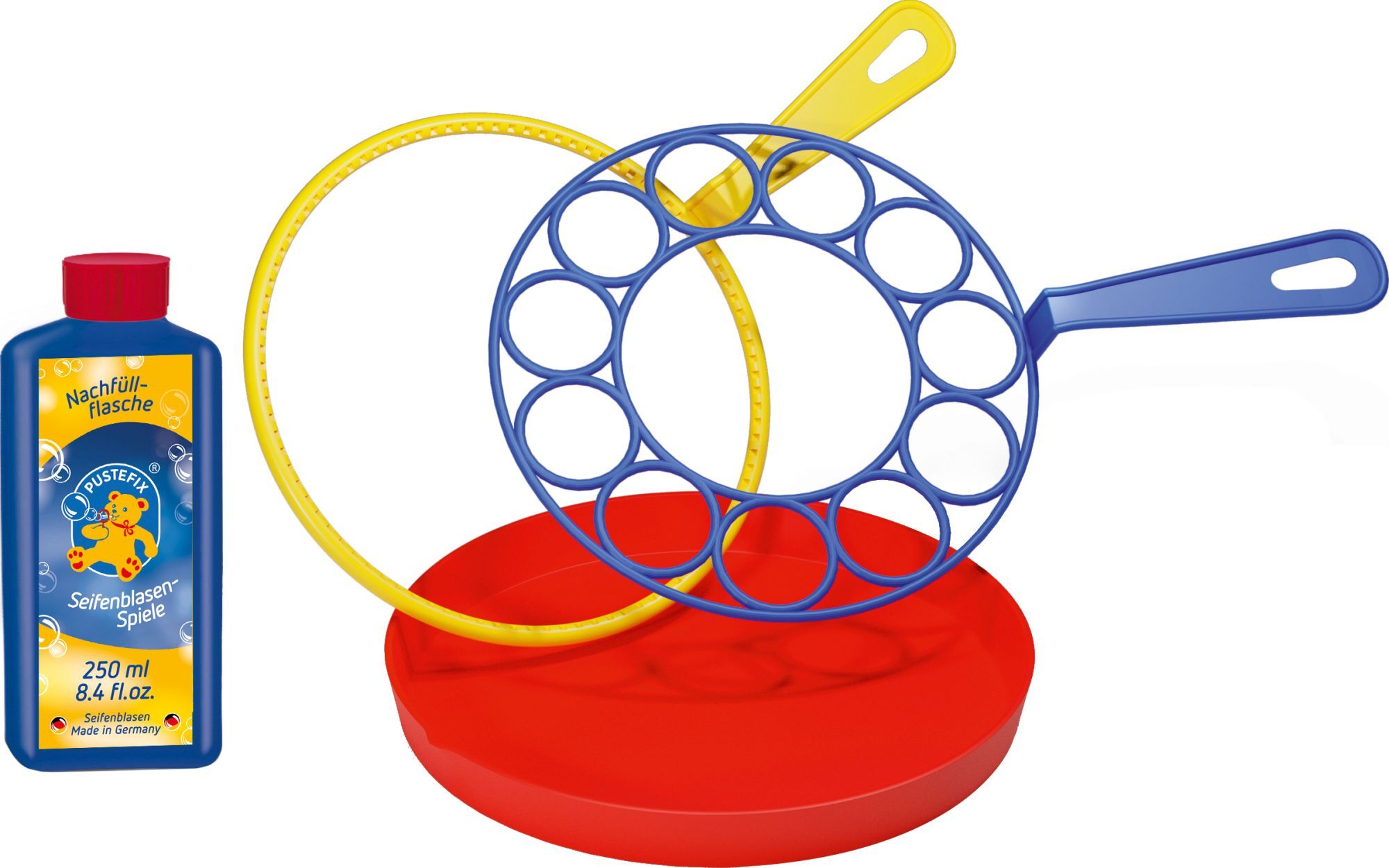 PUSTEFIX Multi Bubbler. Es darf gestaunt werden. Neben den riesigen Seifenblasen werden mit dem Multi-Ring mühelos phantasievolle Seifenschläuche entworfen, in denen noch viele kleine PUSTEFIX Seifenblasen schweben. Der Kreativität sind keine Grenzen gesetzt. ...