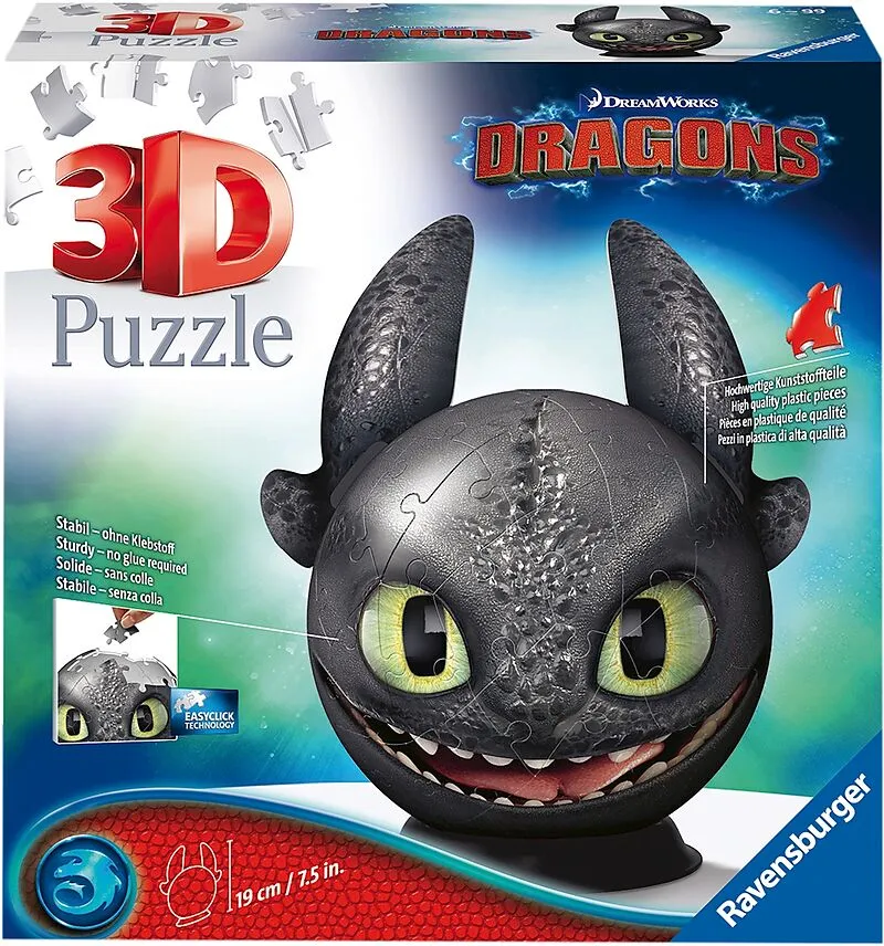 Der kühne Reitdrache Ohnezahn ist einer der größten Helden im Kinohit "Drachenzähmen leicht gemacht". Mit diesem 3D Puzzle-Ball mit den dekorativen Ohren aus stabiler Pappe hält der beliebte Drache Einzug in euer Zimmer. Inhalt Inhalt: 72 nummerierte Kunststof...
