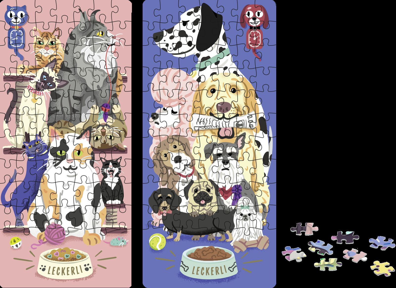Wer puzzelt schneller? Lustige Puzzlechallenge für 2 Personen Wie Hund und Katz ist das Motto bei diesem rasanten Duell! Die Schachtel enthält zwei tierisch süße Puzzles à 70 Teile. Wähle eines der beiden Motive aus und gib alles, um dein Puzzle vor deinem Ge...