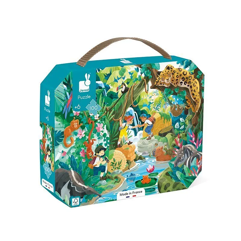 Erkunde den Dschungel und entdecke den Inca-Tempel! Ein schönes 100- teiliges Puzzle aus Karton, um Erinnerungsvermögen und Feinmotorik zu entwickeln. Einfach zu transportieren in einem hübschen Köfferchen mit Stoffgriff. Mit Postervorlage, das Puzzle-Neulinge...