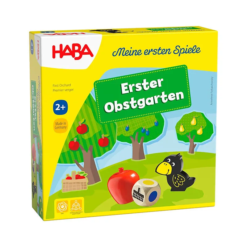HABA Meine ersten Spiele Erster Obstgarten Meine ersten Spiele - Erster Obstgarten ist eine entzückende Kleinkind-Variante des HABA-Spieleklassikers Obstgarten. Schaffen es die Kinder gemeinsam das Obst zu ernten, bevor der freche Rabe Theo den Garten erreicht...