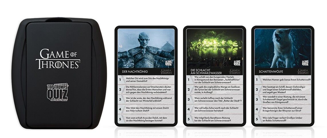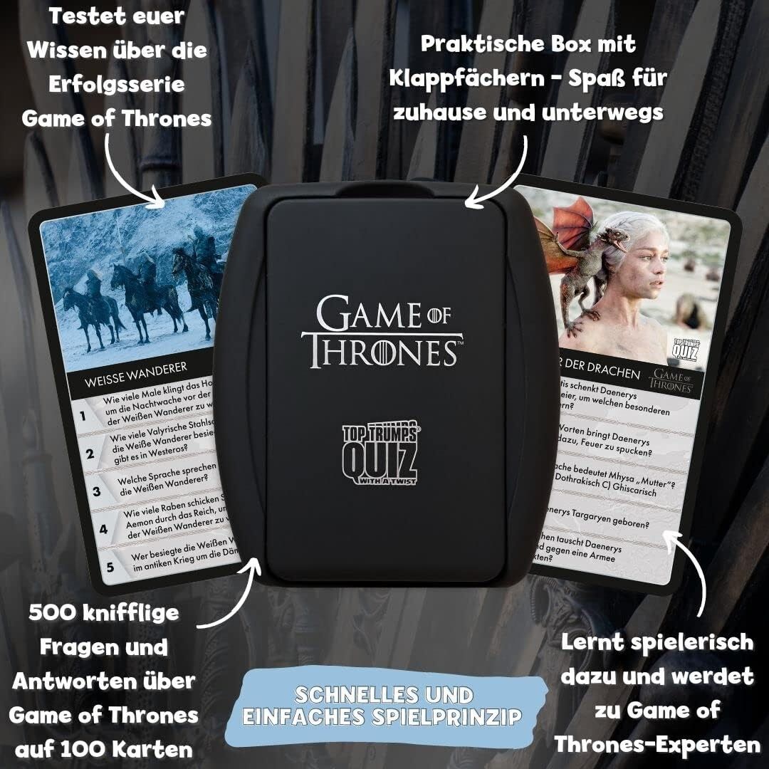 Top Trumps Quiz - Game of Thrones Hörst du das Stampfen der Dothraki-Krieger, während sie ihre Pferde vorbereiten? Die epische Fantasy-Welt von Game of Thrones ruft nach dir! Wenn du ein treuer Fan dieser bahnbrechenden Serie bist, dann fordere dein Wissen mit...