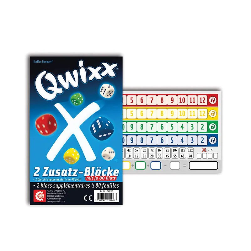 Ersatzblöcke für Qwixx, das beliebte und taktische Würfelspiel mit Kniff. Es gilt so viele Punkte als möglich zu notieren und den Gegner durch Schließen von Farbreihen zu benachteiligen. Viele Wege führen dabei ans Ziel. Welcher Spieler hat die bessere Taktik ...