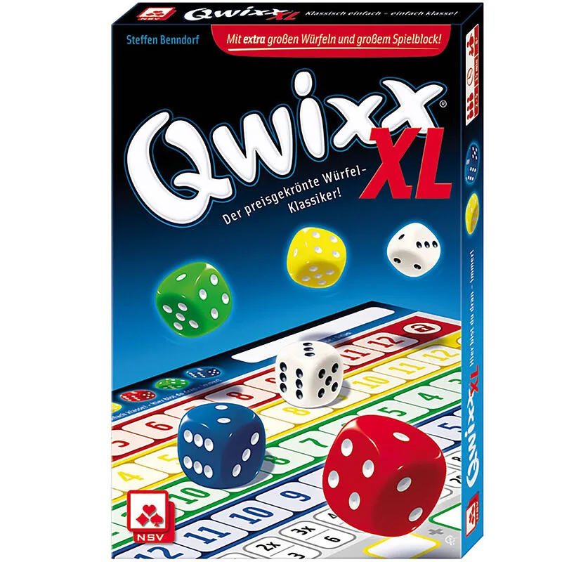 Bei Qwixx XL ist alles etwas größer. Größere Würfel (18mm) und ein größerer Spielblock (A6) machen alles einfacher. Ansonsten bringt auch Qwixx XL alles mit, was ein echter Würfel-Klassiker braucht: einfache Regeln, niedriger Preis, großer Spielspaß! Und das B...