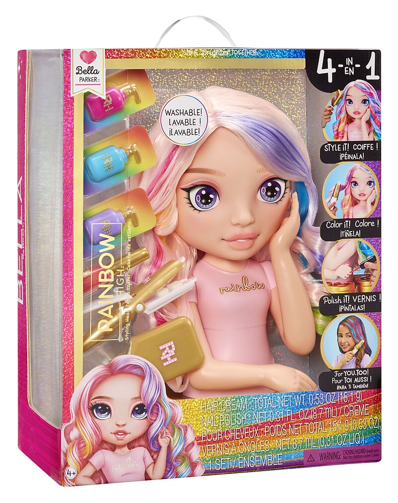 Rainbow HIgh Styling Head Playset Ca. 33 cm großer Stylinghead - Bella. Langes Haar zum Stylen. Inkl. Stylingtools wie Haarbürste, 3 Haarcremes, Haarfärbegerät und Nagellack. Alle Stylingprodukte auch für Kinder verwendbar. Ab 4 Jahren. Der erste Rainbow High ...