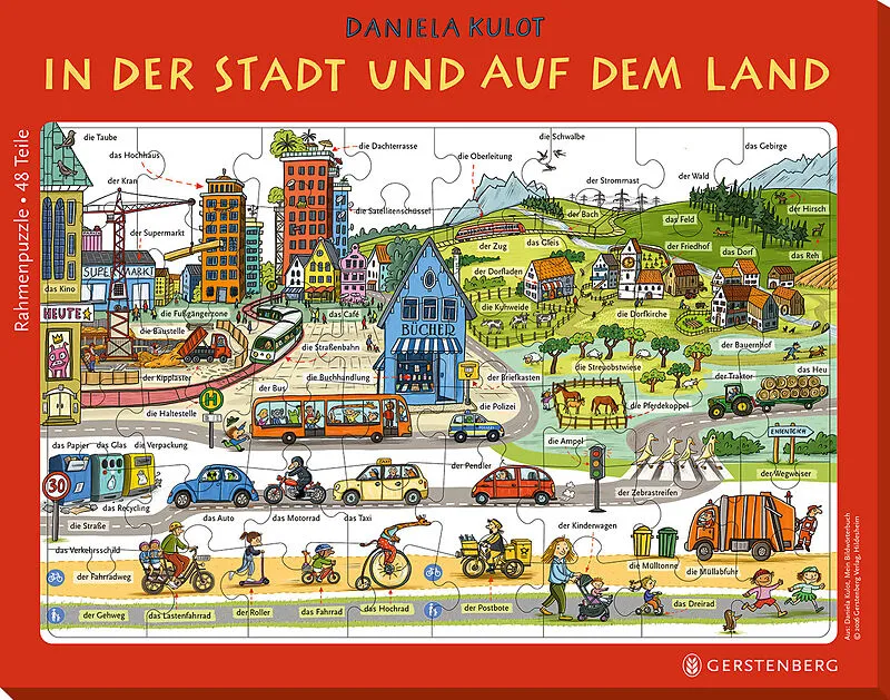 So viel gibt es in der Stadt und auf dem Land zu entdecken! Bei diesem großen Rahmenpuzzle mit 48 Teilen können kleine Puzzlefans ihre Feinmotorik und ihren guten Blick unter Beweis stellen. Achtung! Das Puzzle enthält verschluckbare Kleinteile und ist nicht g...