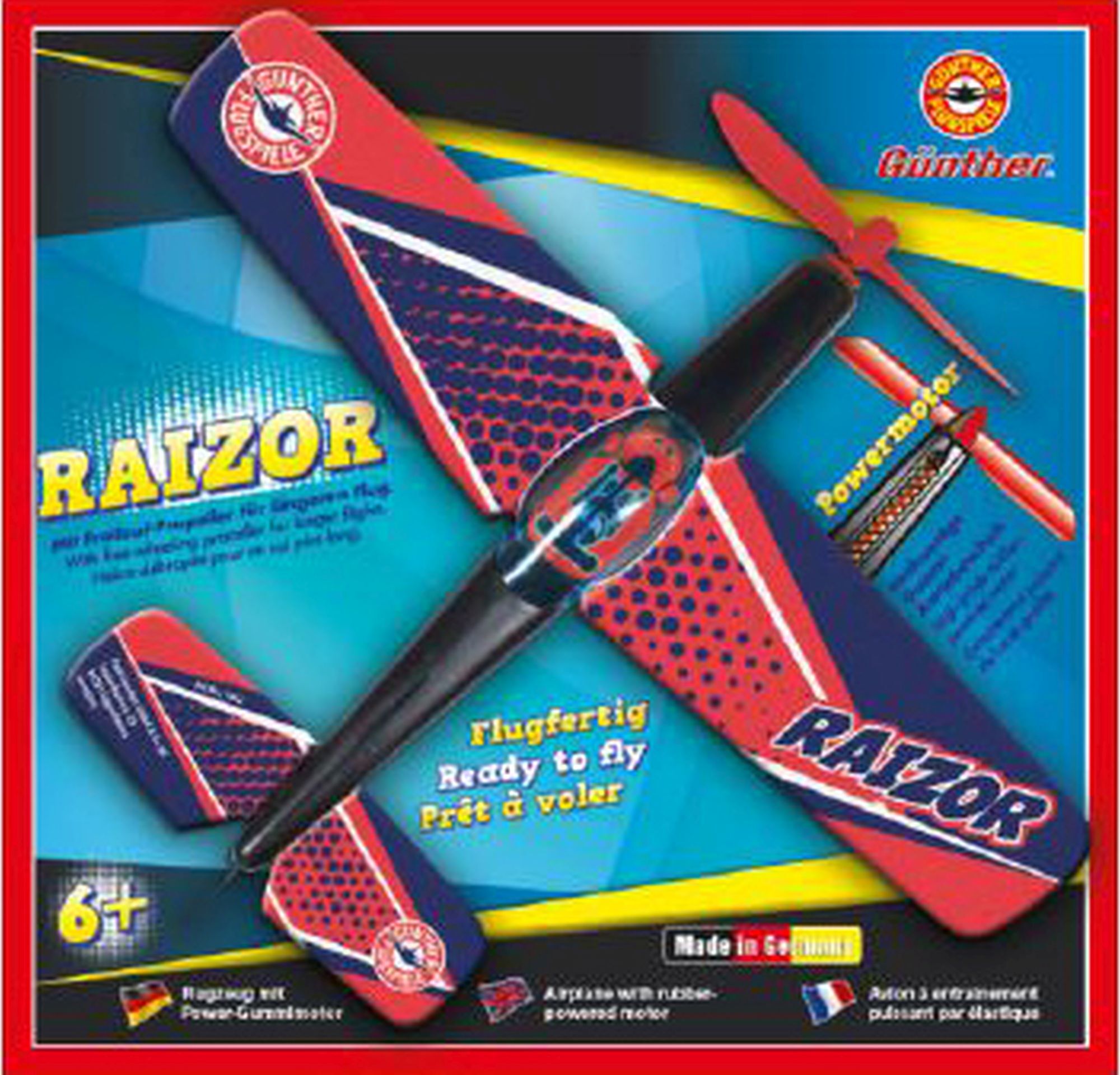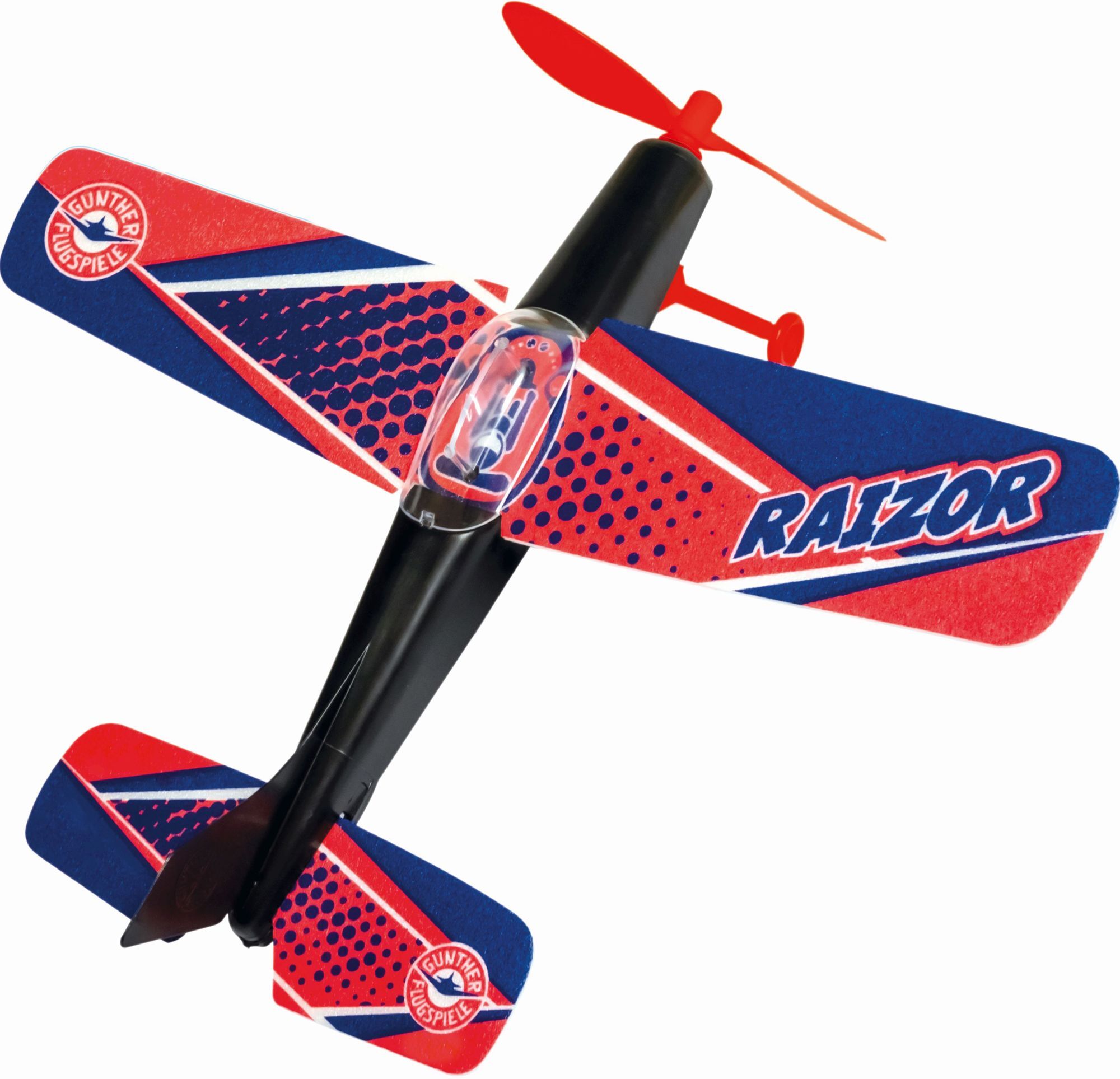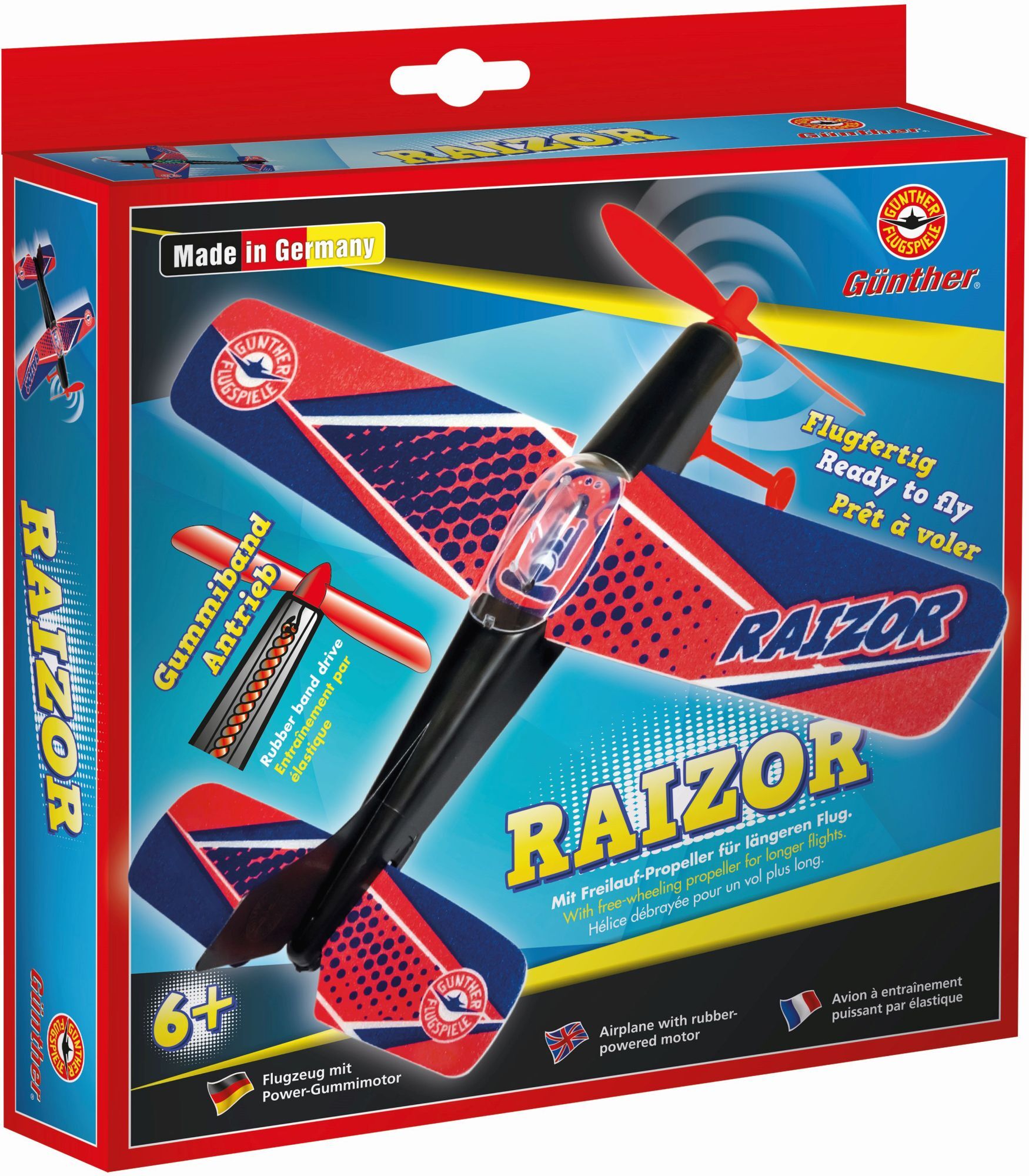 RAIZOR Gummimotor-Flugmodell Fliegen mit der Kraft des aufgedrehten Gummibandes! Einfach Propeller rechts herum drehen und damit den Gummi aufziehen, das Flugzeug mit einen kleinen Schubs gegen den Wind aus der Hand starten. Mit Freilaufpropeller für längere F...