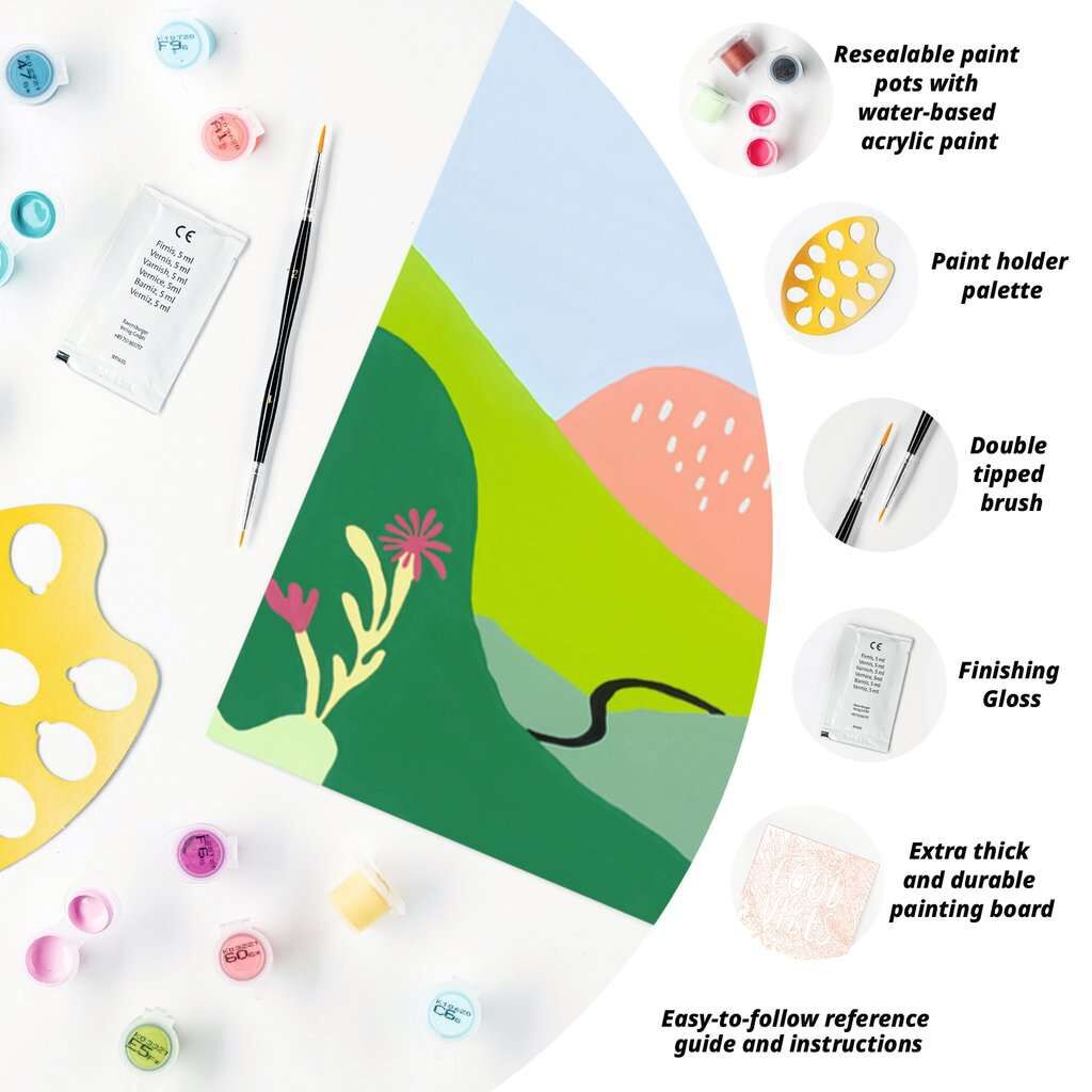 Inhalt: Maltafel im Format 24 x 30 cm, Acrylfarben auf Wasserbasis in wiederverschließbaren Näpfchen, Doppelpinsel, Farbpalette, Vorlageblatt, Glanzlack und Anleitung Ohne Rahmen!