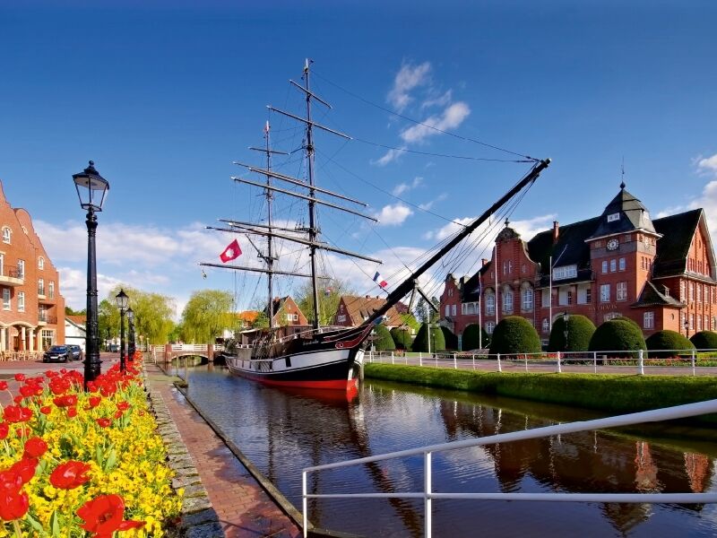 Papenburg im Nordwesten Deutschlands ist aus einer Fehnkolonie hervorgegangen und war ein Vorreiter der Moorkolonialisierung. Viele Kanäle prägen auch heute das malerische Stadtbild.