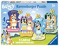 Vierfacher Puzzlespaß: Entdecke Bluey und seine Freunde auf 4 farbenfrohen Puzzlemotiven! Jedes der vier Puzzles ist formgestanzt und etwa 25 x 35 cm groß, die großen Puzzleteile aus extradickem Karton variieren von 10 Teilen bis 16 Teilen und sind perfekt gee...