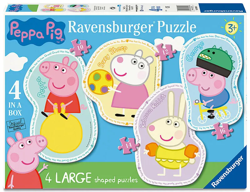 Vierfacher Puzzlespaß: Entdecke Peppa Pig und ihre Freunde auf 4 farbenfrohen Puzzlemotiven! Jedes der vier Puzzles ist formgestanzt und etwa 25 x 35 cm groß, die großen Puzzleteile aus extradickem Karton variieren von 10 Teilen bis 16 Teilen und sind perfekt ...