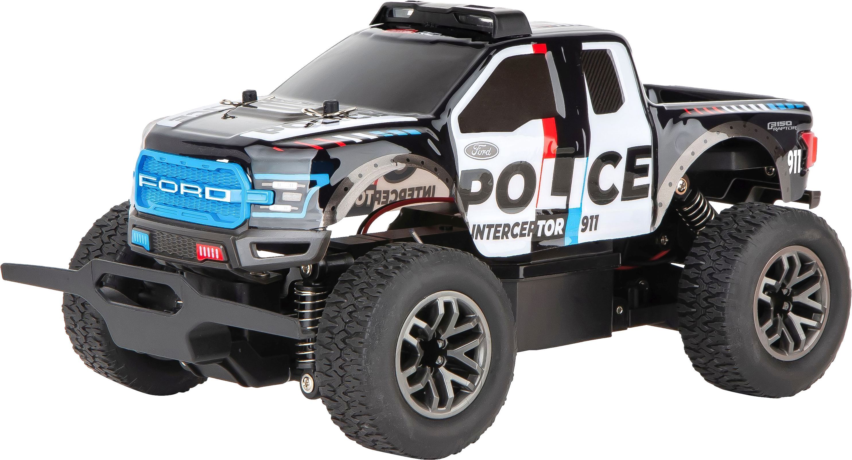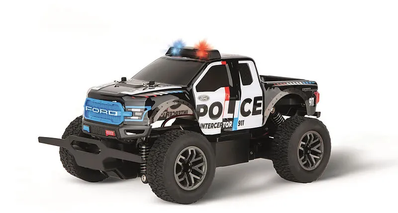 CARRERA RC 2,4GHz Ford F-150 Raptor Police Dieses Kraftpaket stellt Verbrecher auch noch im Offroad-Einsatz und ist mit Luftreifen, langlebigem Metallgetriebe, flexibler und robuster Rennkarosserie und der präzisen Digital Proportional Steuerung bereit für Ein...