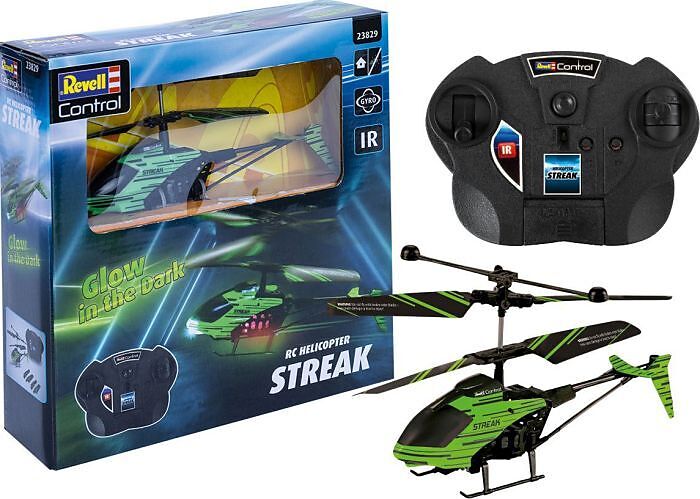 RC Helikopter Streak Glow in the dark, Revell Control Ferngesteuerter Hubschrauber Kleiner Indoor-Helikopter mit coolem Glow! Durch seine Effektcolorierung und den integrierten LEDs leuchtet der Streak im Dunkeln. Dank der 2-Kanal-IR-Steuerung muss sich der Pi...
