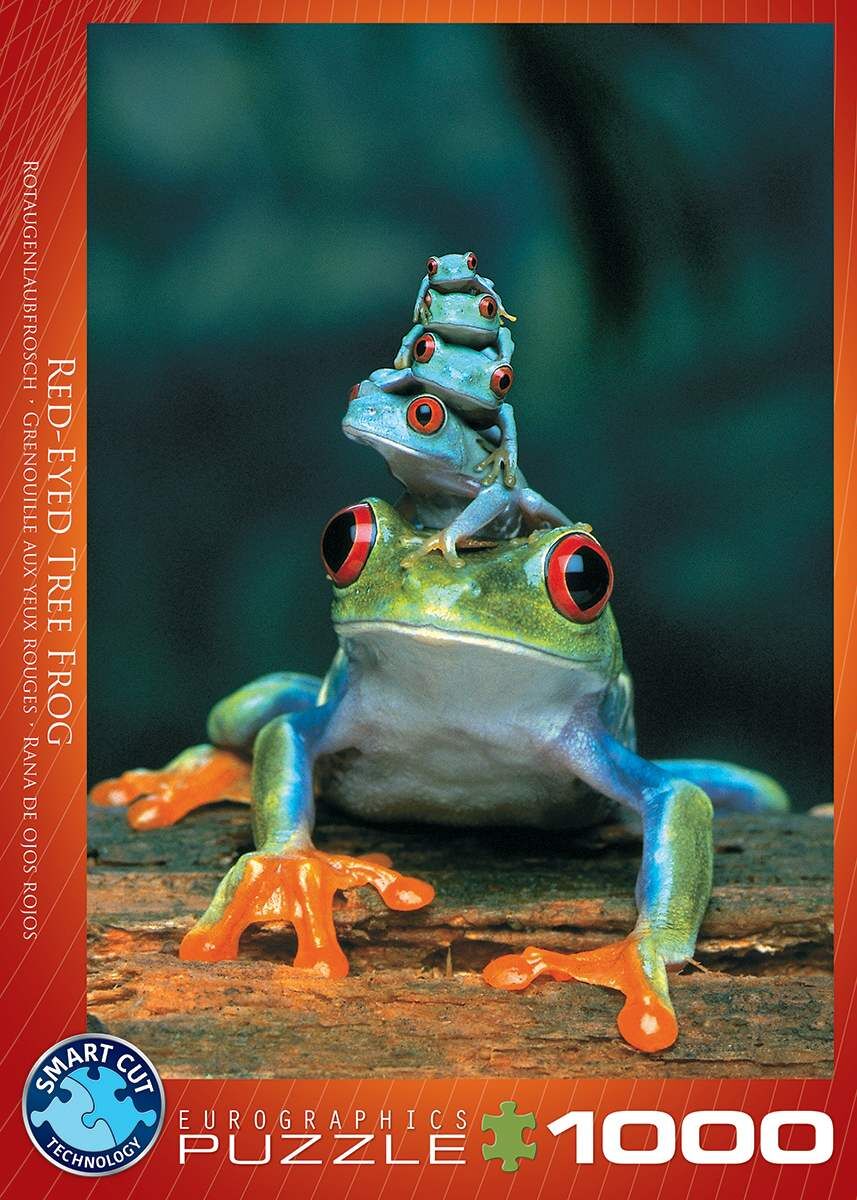 EuroGraphics Rotaugenlaubfrosch 1000-Teile Puzzle. Verpackungsabmessungen 35 x 25 x 6 cm. Abmessungen des zusammengebauten Puzzles 48 x 68 cm. Rotaugenlaubfrösche bilden oft Pyramiden mit ihren Eltern nicht nur für sicheren Transport sondern auch um Körperwärm...