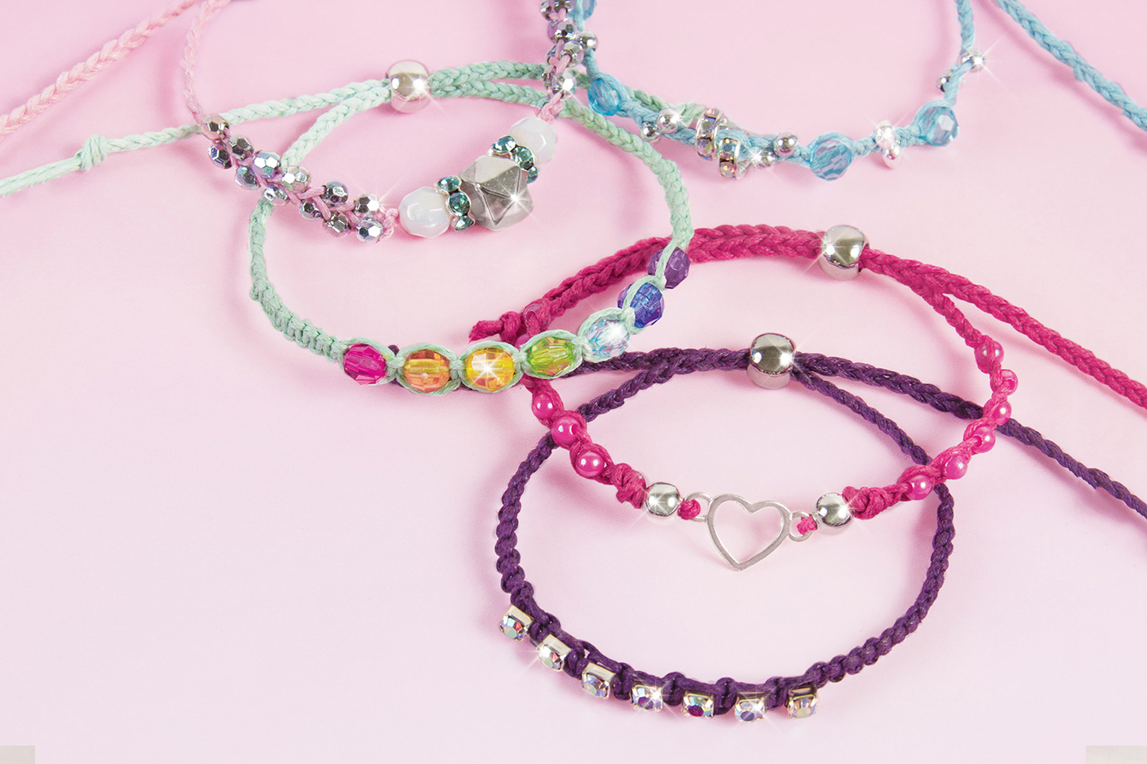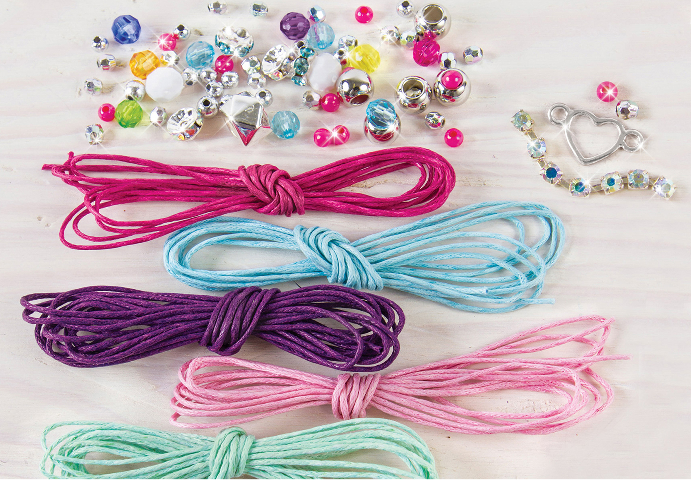 Set zum Herstellen von glitzernden Armbänder. Inhalt: Über 70 stylische Perlen, gewachster Faden in 5 Farben (8,5 m), Edelsteine, Anhänger und Anleitung.