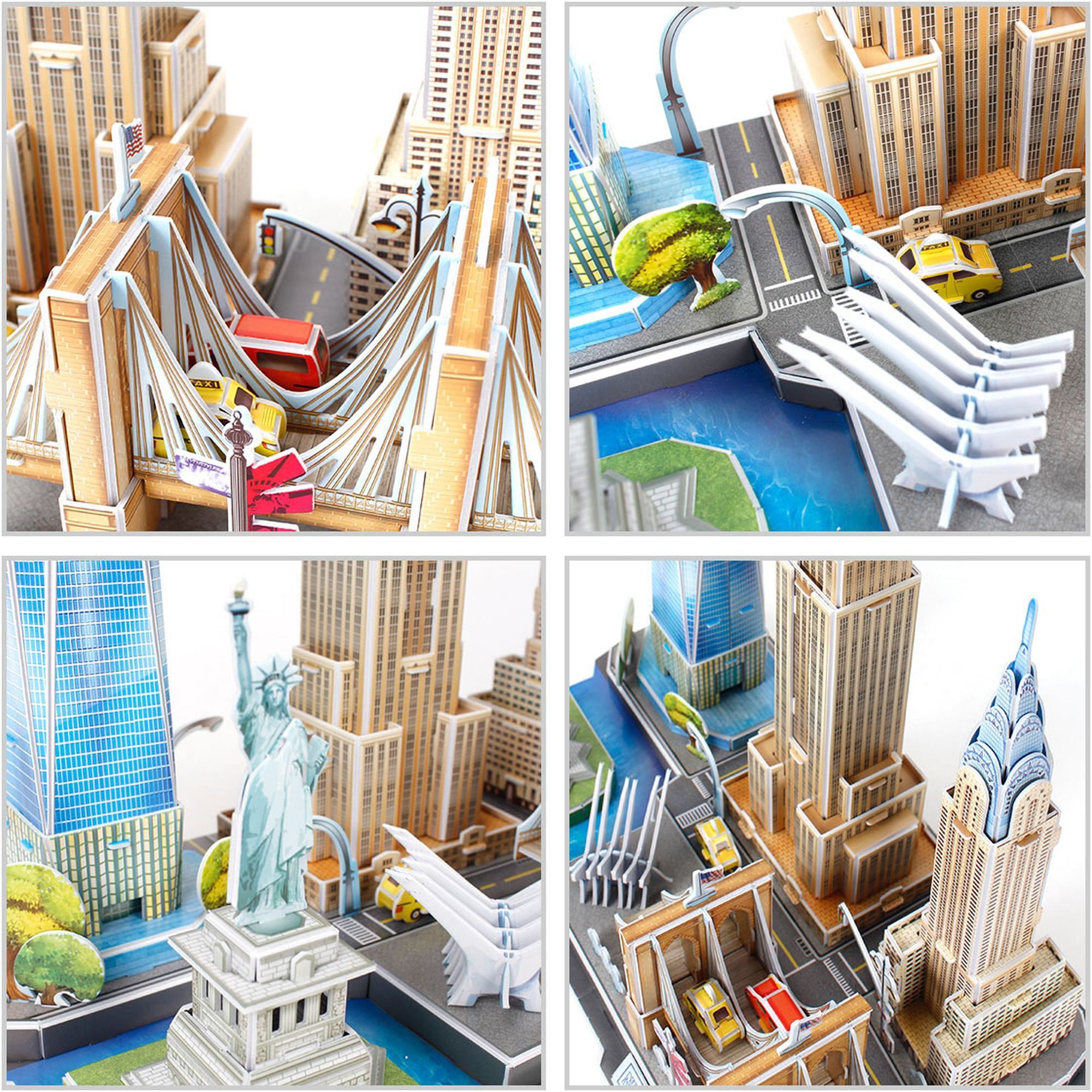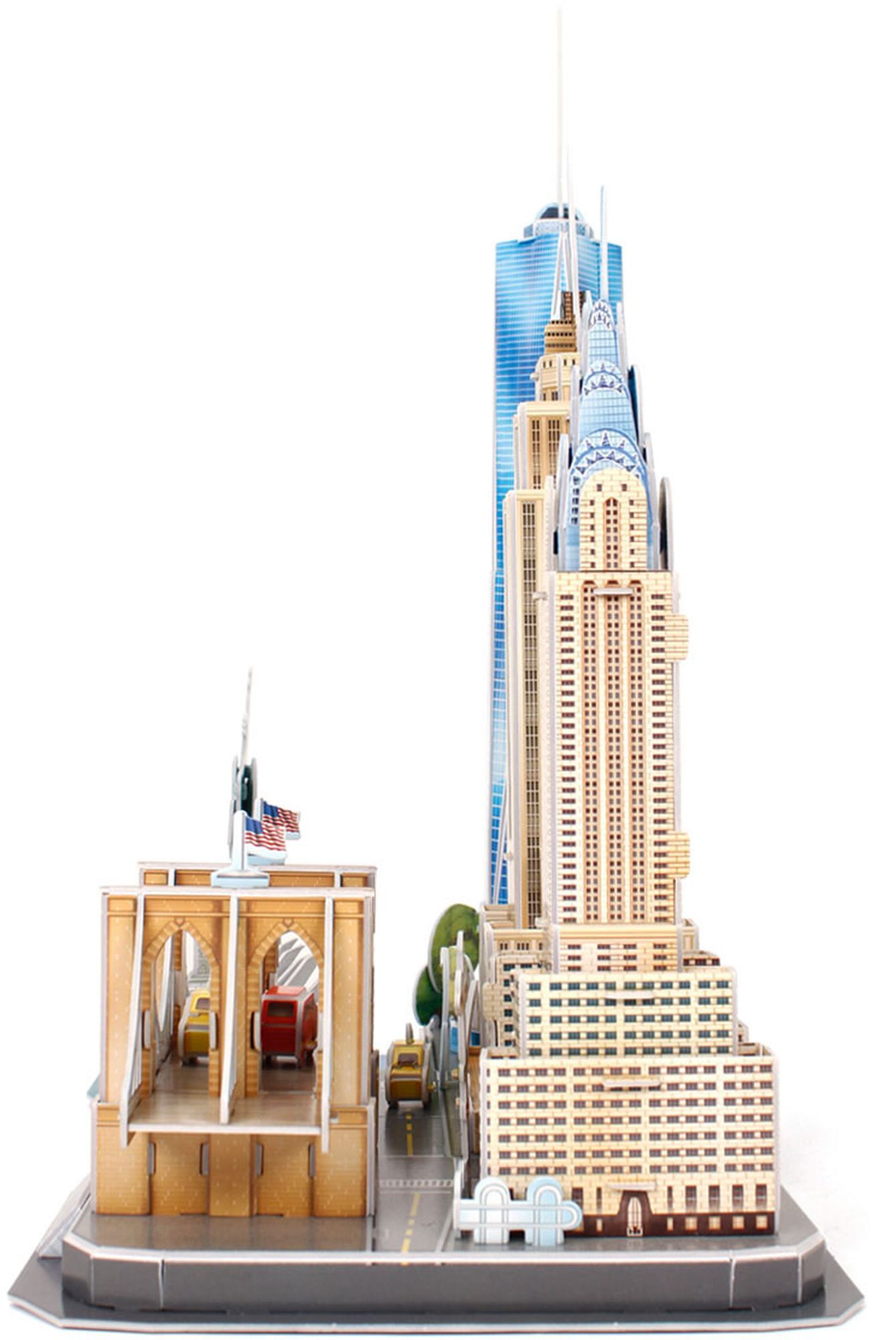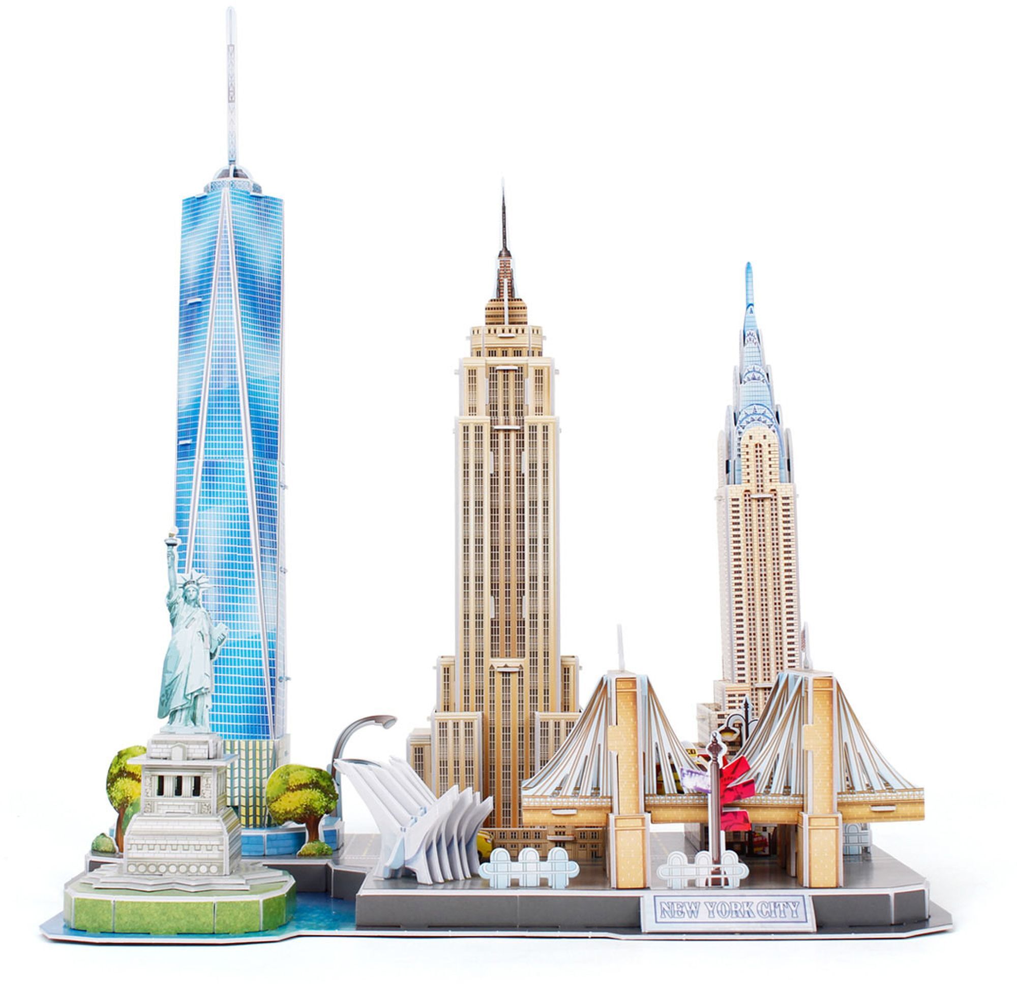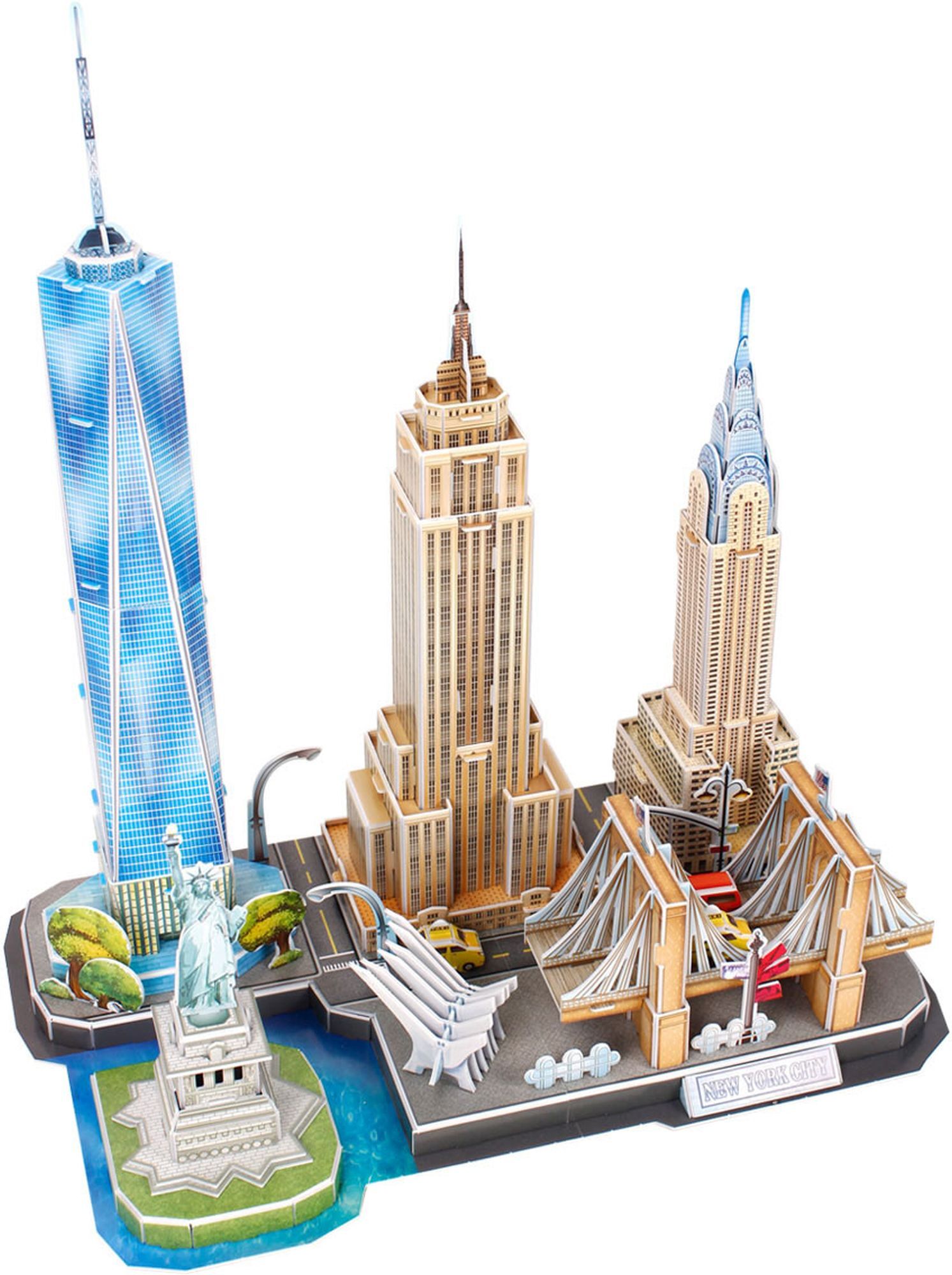 3D Puzzle der New Yorker Skyline. Auf einer Grundfläche sind unter anderem Empire State Building, Freiheitsstatue und Brooklyn Bridge vereint. Länge 37 cm. 123 Einzelteile. Bauzeit ca. 150 bis 180 Minuten. Ab 10 Jahren.