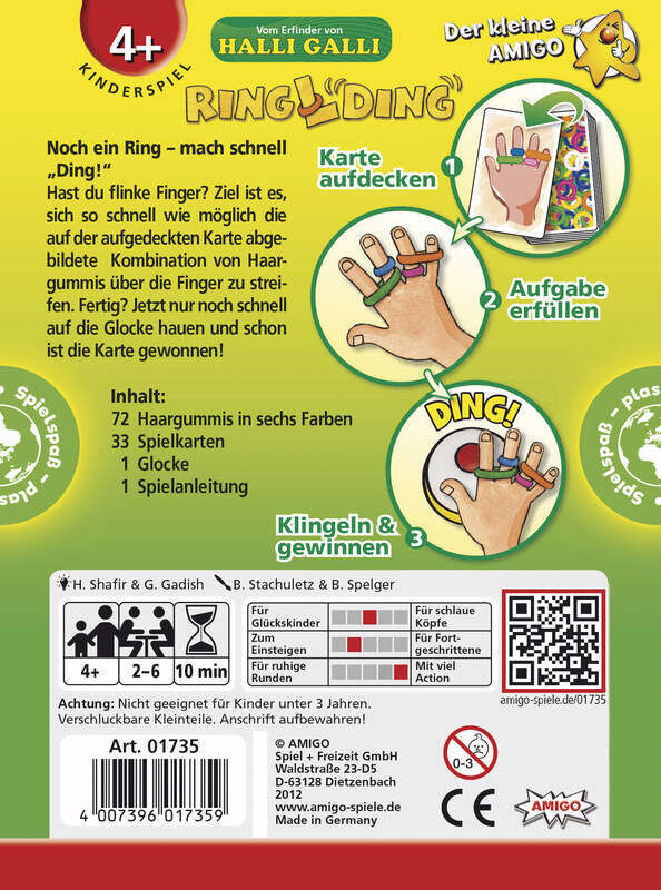 RinglDing RinglDing MBE3 Hast du flinke Finger? Ziel ist es, sich so schnell wie möglich die auf der aufgedeckten Karte abgebildete Kombination von Haargummis über die Finger zu streifen. Fertig? Jetzt nur noch schnell auf die Glocke hauen und schon ist die Ka...