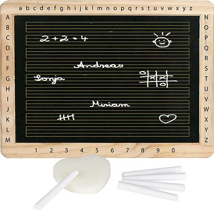Eine handliche Tafel zum Bemalen, Schreiben üben oder für schnelle Notizen. Eine Seite mit Linien und eine Seite blanko.Inklusive 3 Kreidestücken und 1 Schwamm. Maße: 30 x 22 cm.