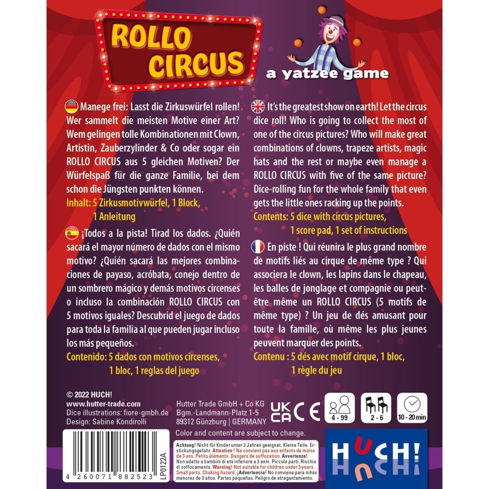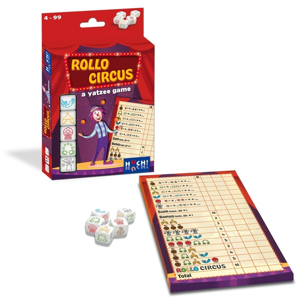 Eine einfache Yatzee-Variante für Kinder ab 4 mit tollen Zirkusmotiven. Pro Runde darf bis zu dreimal gewürfelt werden. Ziel ist es, durch geschicktes Kombinieren möglichst viele Vorgaben punktereich zu erfüllen. Die Ergebnisse werden auf dem mitgelieferten Bl...