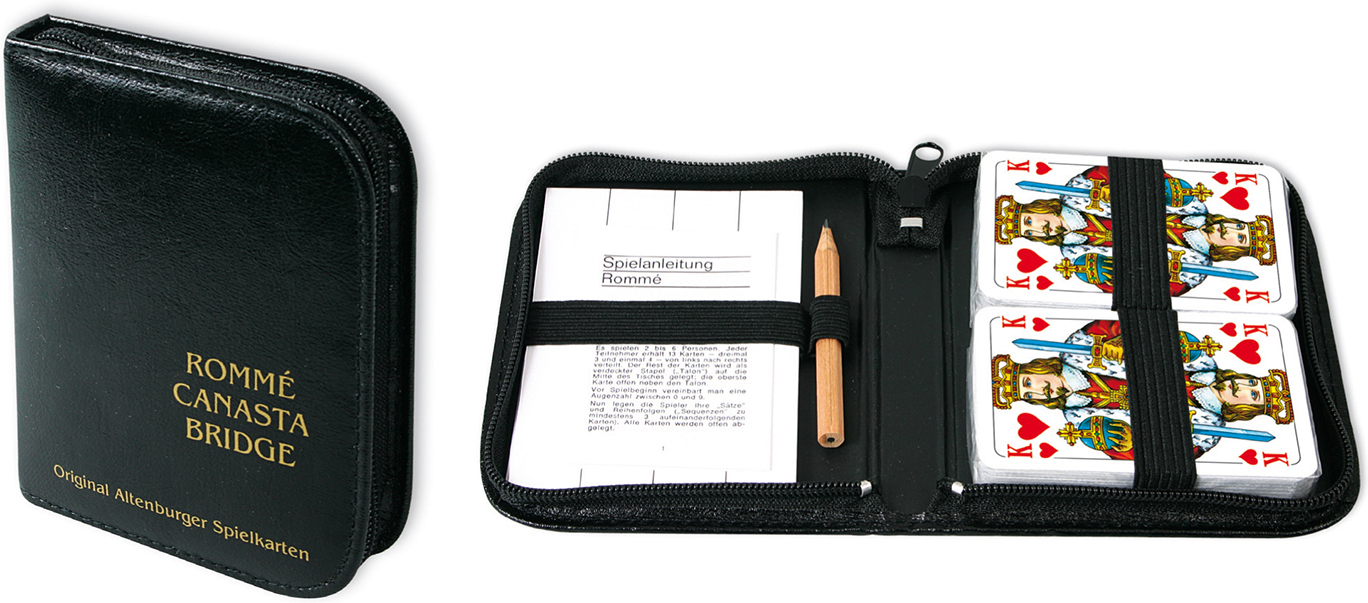 ASS Rommé, französisches Bild, Lederetui. Kartenspiel Die beliebtesten Kartenspiele der Welt sind mit diesem Spielkartenset spielbar: Verpackt in einem hochwertigen Lederfaseretui bieten die 2 x 55 Blatt unzählige Möglichkeiten für einen spannenden Spieleabend...