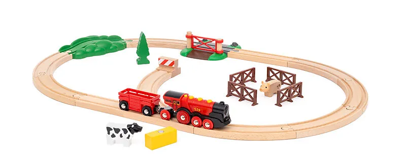 Tuckere über die Gleise mit dem Rote Lola Bauernhof Zugset. Dieses 24-teilige Bauernhof-Zugset enthält die beliebte Rote Lola Batterielok # mit Vorwärts- und Rückwärtsgang, Scheinwerfern, Geräuschen und sogar einem Freilaufmodus, wenn die Batterien fast leer s...