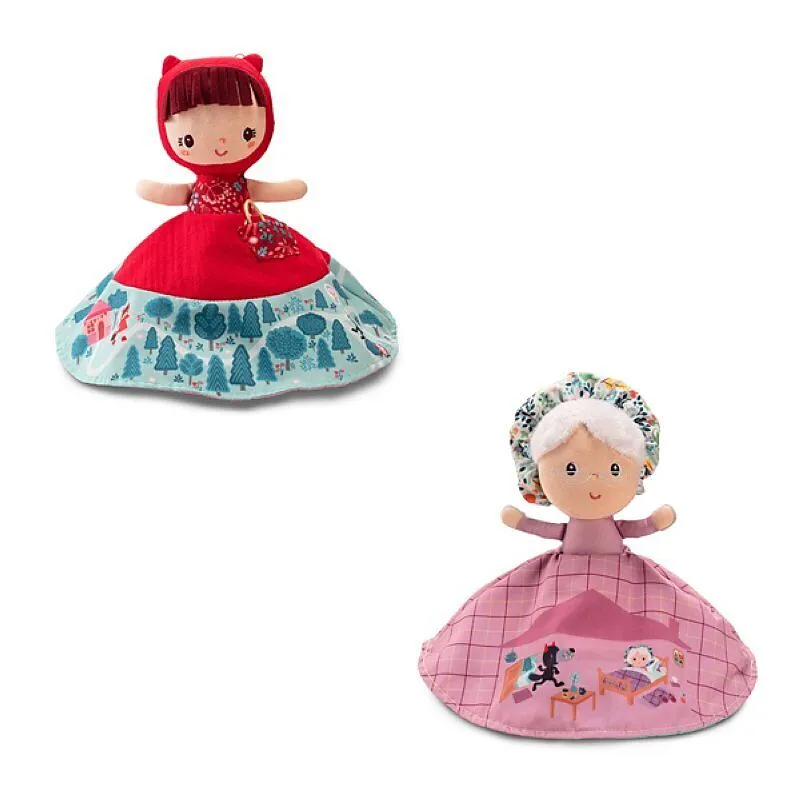3 Figuren in 1 Puppe. Mit dieser originellen Erzählpuppe spielen Sie die Geschichte von Rotkäppchen nach. Im Handumdrehen verändern Sie Rotkäppchen in die Grossmutter oder in den Wolf. Die Illustrationen auf dem Kleid von Rotkäppchen stellen die Geschichte dar...