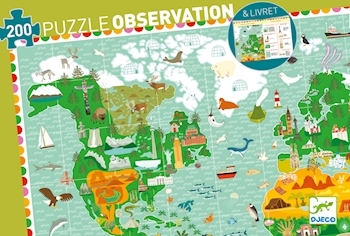 ab 6 Jahren 200 Teile 61x38cm Schönes Entdekerpuzzle auf welchem eine Reise um die Welt dargestellt wird. Jeder Teil der Welt ist mit den für ihn charakteristischen Tieren, Bauwerken oder anderen Dingen abgebildet. Im zusätzlich mitgelieferten Büchlein, sind v...