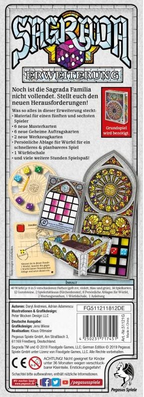 Dieses Spiel ist eine Erweiterung und kann nur zusammen mit dem Grundspiel Sagrada gespielt werden! Die ersten Fenster wurden präsentiert, doch die Auftraggeber sind noch nicht zufrieden. Also heißt es wieder: frisch ans Werk und neue Fensterentwürfe entwickel...