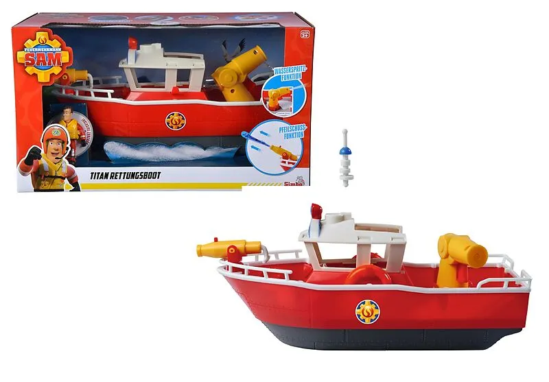 Sam Titan Feuerwehrboot Einsatzfahrzeug - Titan ist eines der Wasserfahrzeuge aus Feuerwehrmann Sam und kann von den Kindern sowohl im Kinderzimmer als auch im Wasser bespielt werden. Schwimmt - das rote Feuerwehrboot schwimmt auf dem Wasser und ist somit für ...