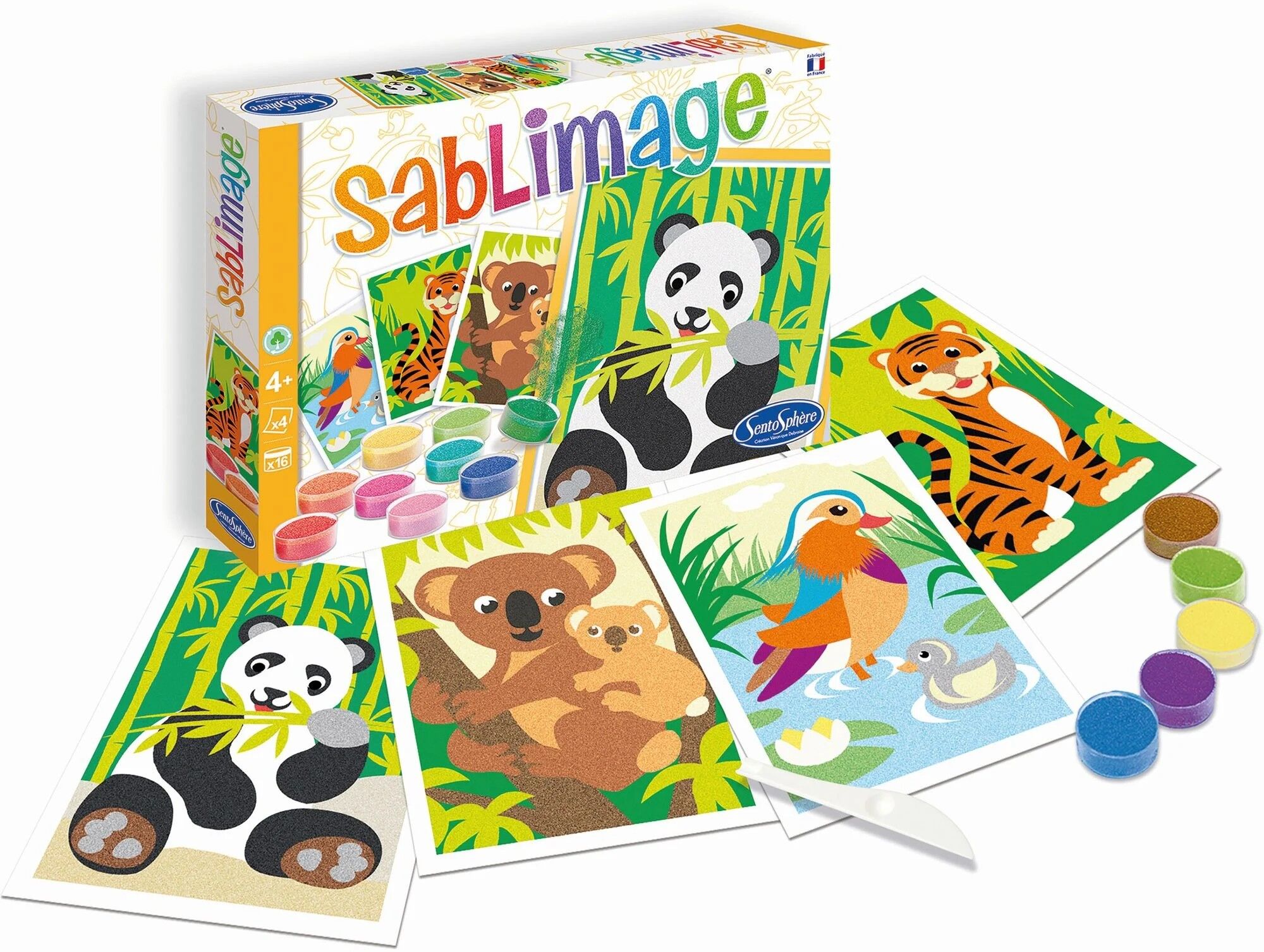 Vollständiges Sandbilder-Bastelset für Kinder mit vier liebevoll designten Tier-Motiven zum Selbergestalten. Die Verpackung kann zum Bilderrahmen für deine Sand-Kunstwerke umfunktioniert werden. Bunte Sandbilder entstehen durch einfaches Abziehen der Klebefoli...